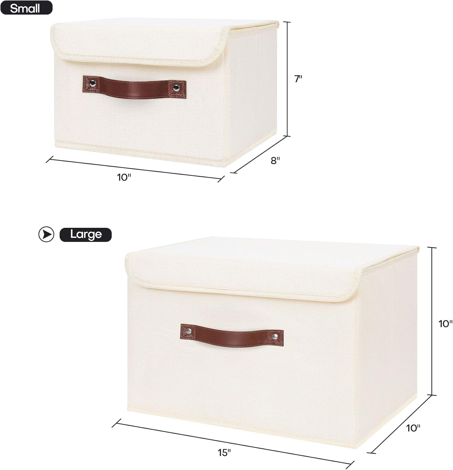 Front faux sturdy leather handle and 2 side fabric handles for easy pick up/down or movement. Stackable and collapsible design for space-saving organization and storage.