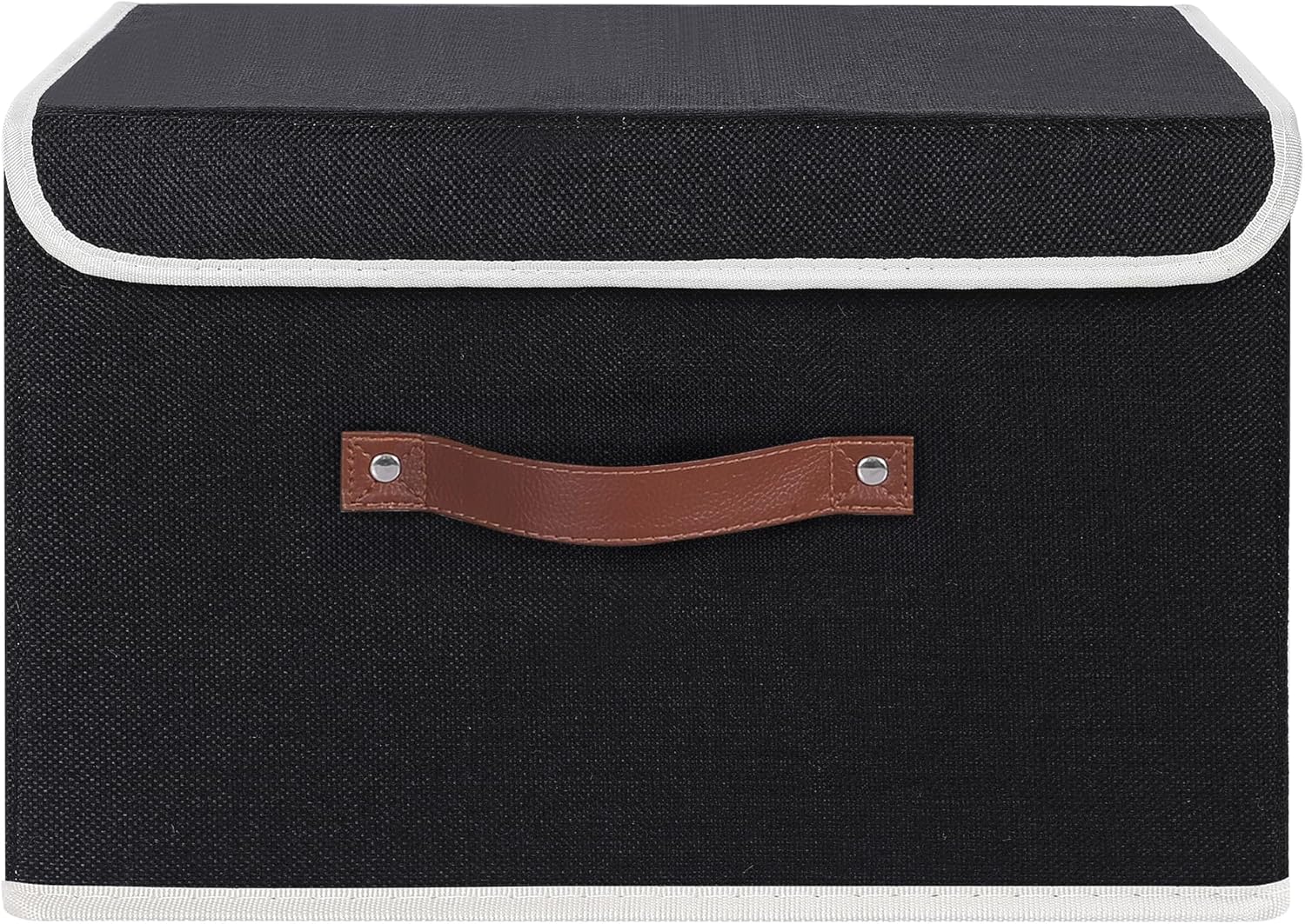 Front faux sturdy leather handle and 2 side fabric handles for easy pick up/down or movement. Stackable and collapsible design for space-saving organization and storage.