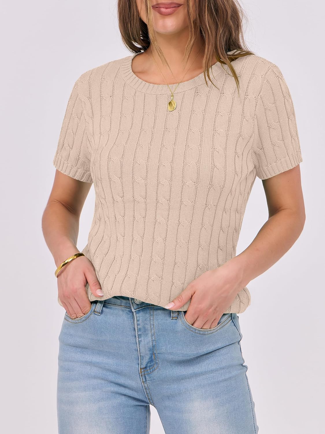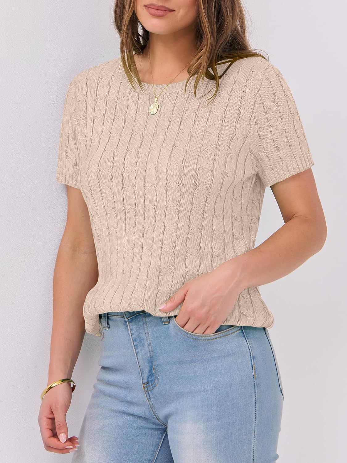 ANRABESS Womens Short Sleeve Sweaters Tops Crewneck Cable Knit Casual Soft Pullover Shirt 2025 Spring Summer Business Outfits