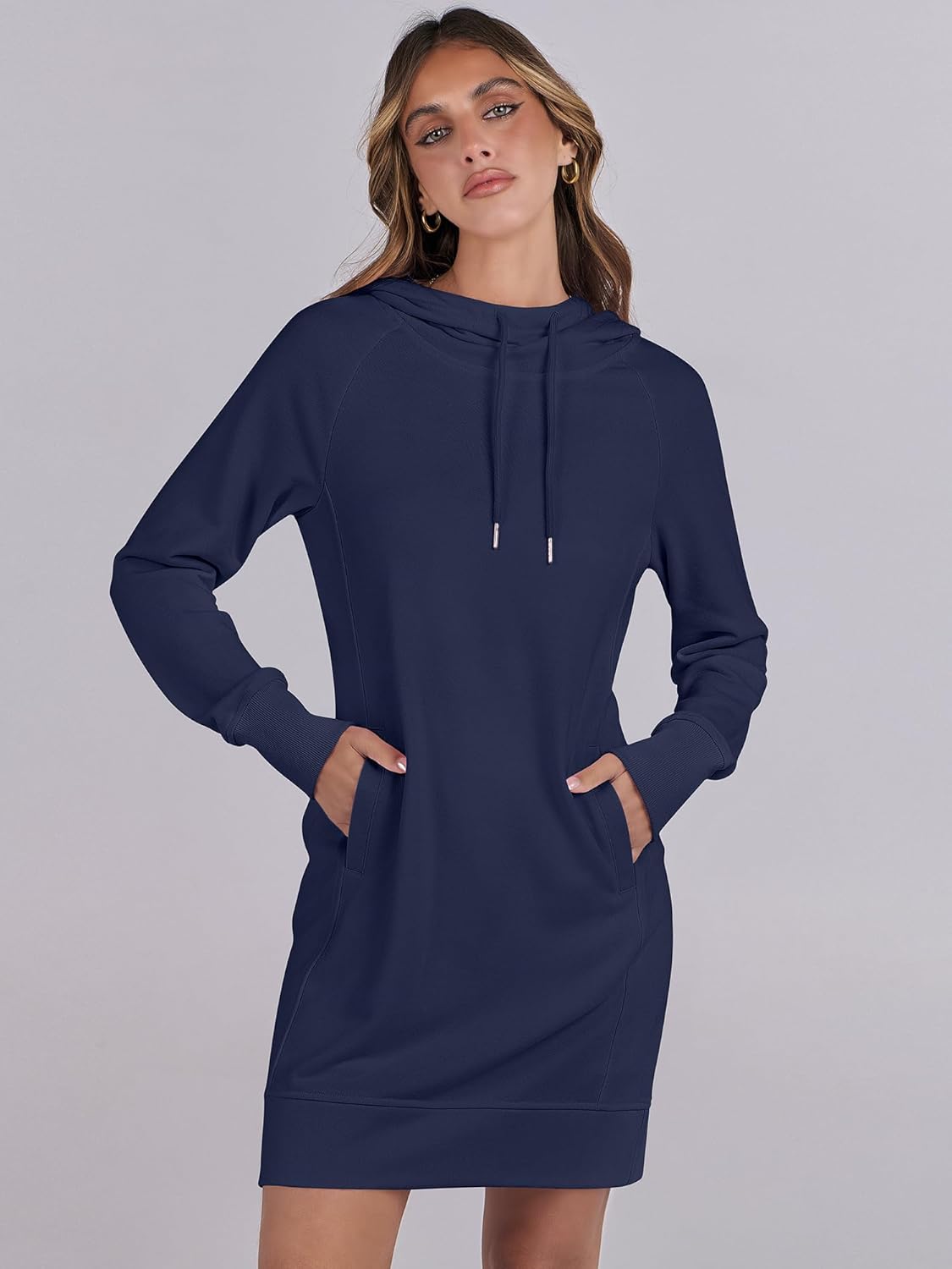 Customers find the dress fits like a cozy sweatshirt and appreciate its style, with one noting the flattering pocket lines. The dress is warm for cold weather, has good material quality, and customers like its light thickness and pockets. However, the color receives mixed feedback, with several customers noting it’s too see-through, and the fabric thickness is criticized for being thin.