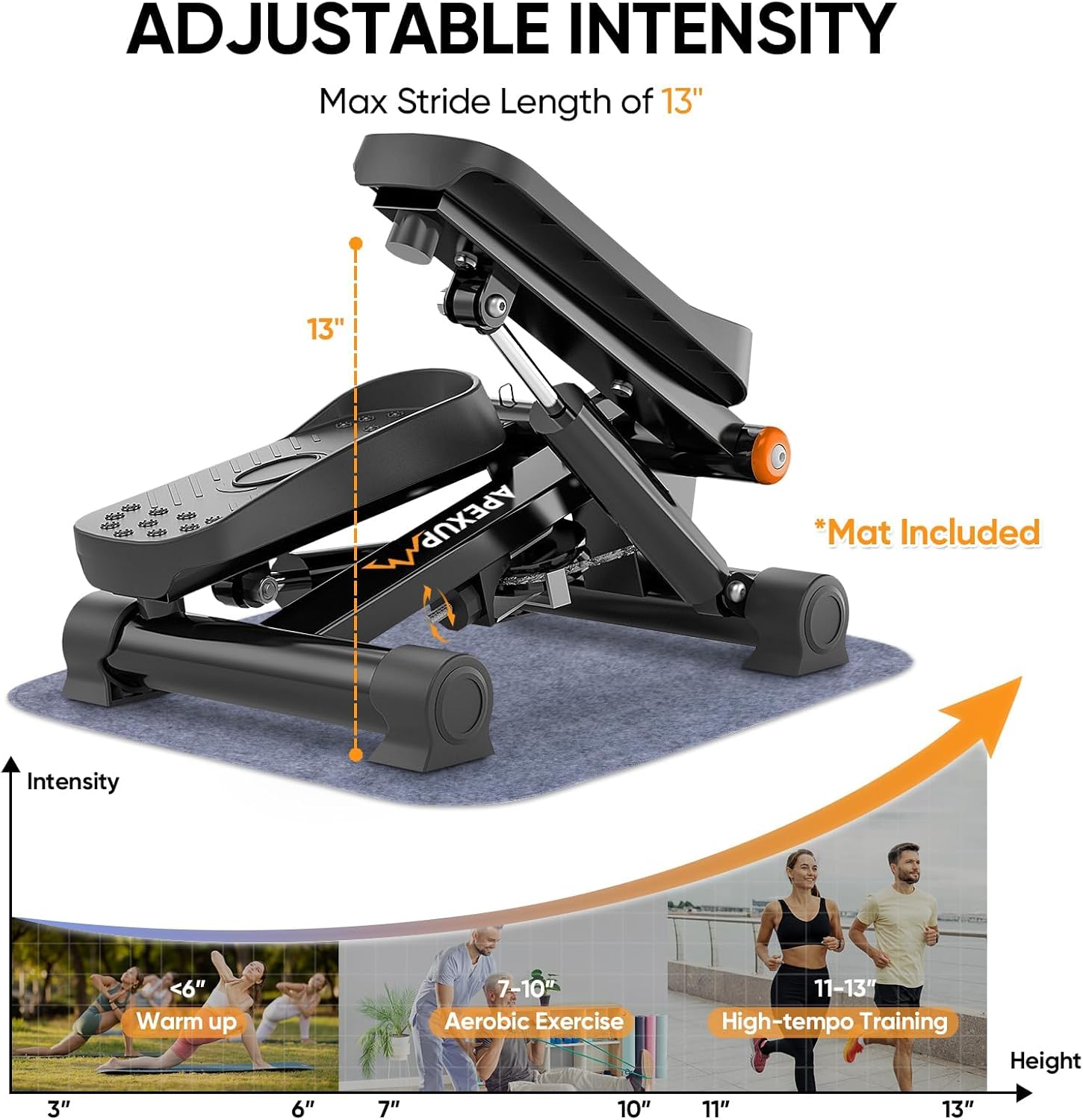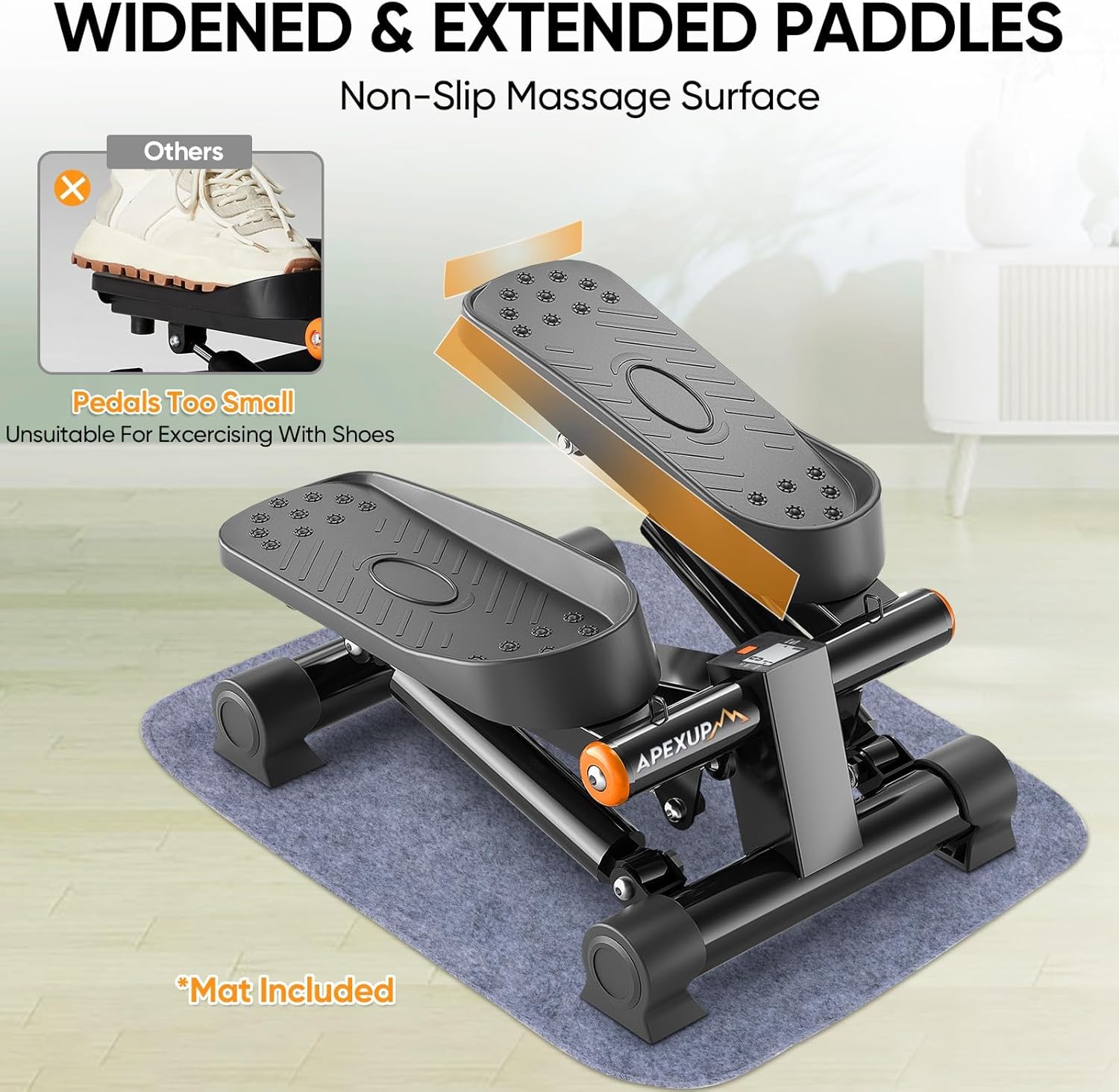 Durable and Adjustable: APEXUP Stepper for exercise uses a 1.5mm thickened commercial stainless steel, sturdy and durable; It features a wider and longer design with a non-slip massage surface, allowing you to use it barefoot or wear shoes; The mini stepper exercise machine can easily customize intensity levels to suit your fitness needs