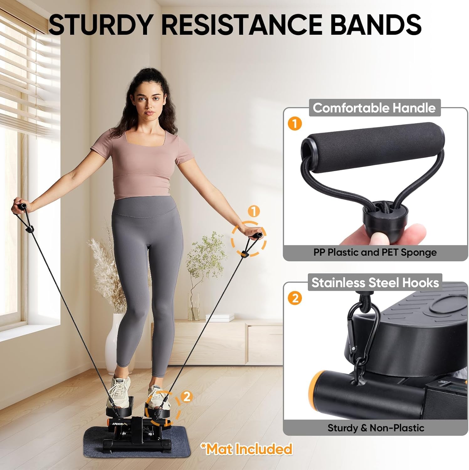 Full Body Cardio Exercise: The stepper machine allows you to experience effective aerobic exercise through continuous stepping, promoting the buttocks and legs fat burning and muscle strengthening; Two resistance bands enhance upper body workouts