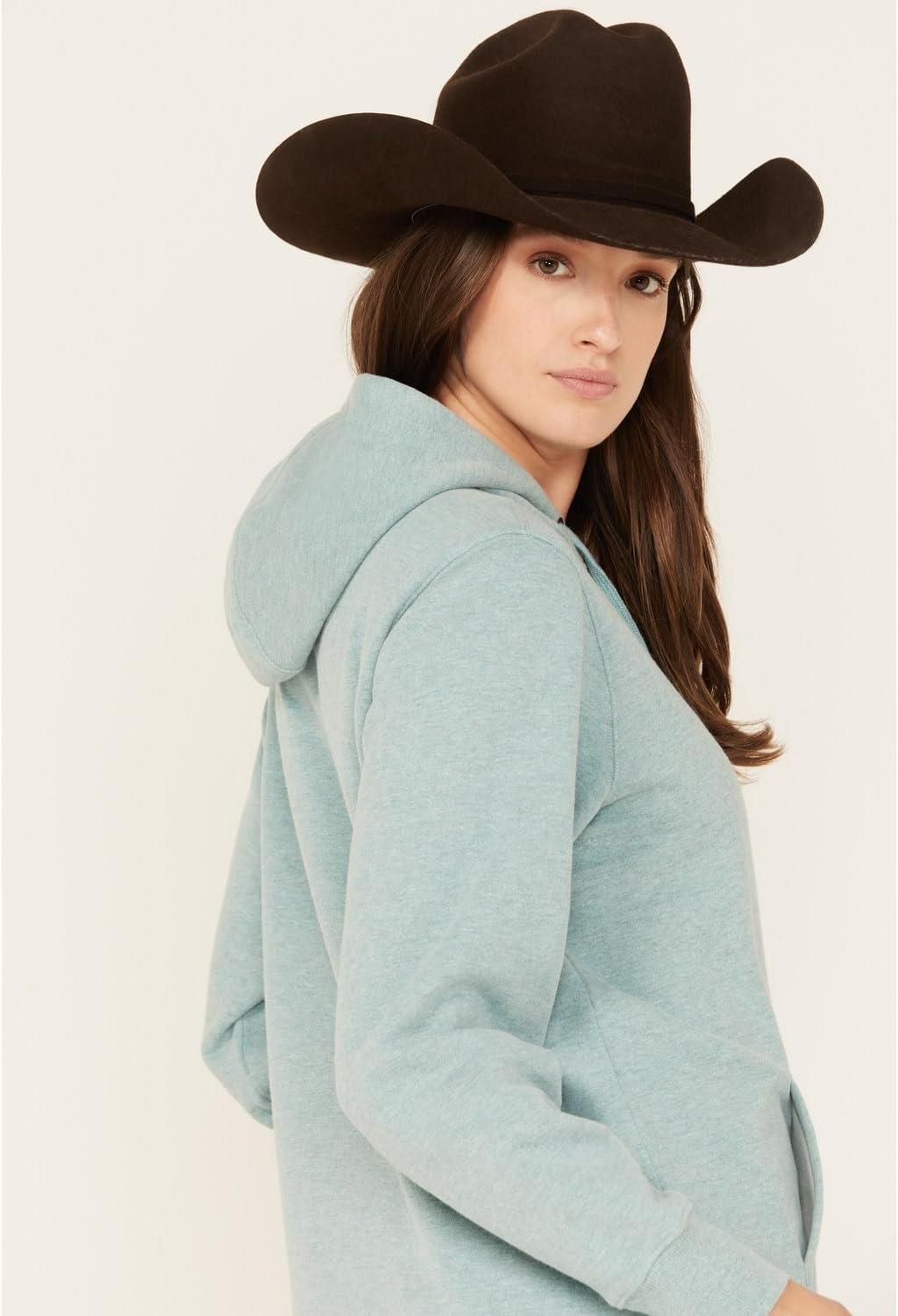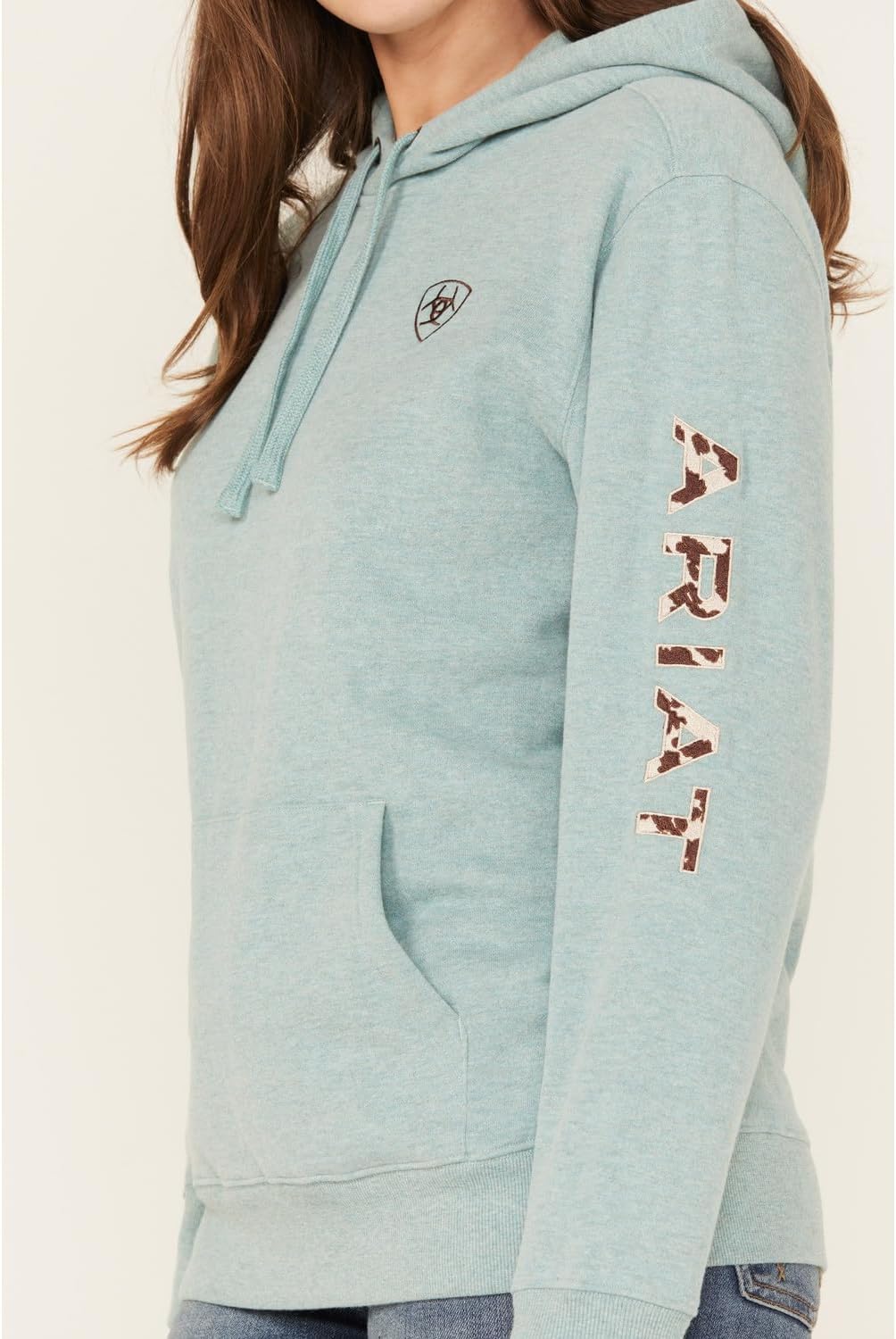 Model is 5’10 wearing a size medium, Attached hood with adjustable drawstrings, Long sleeves, Front kangaroo pocket, Heather blue design, Cow print Ariat logo embroidered on left sleeve, Ariat logo embroidered on left chest, Rib knit cuffs and hem, Machine wash cold, tumble dry low, Imported