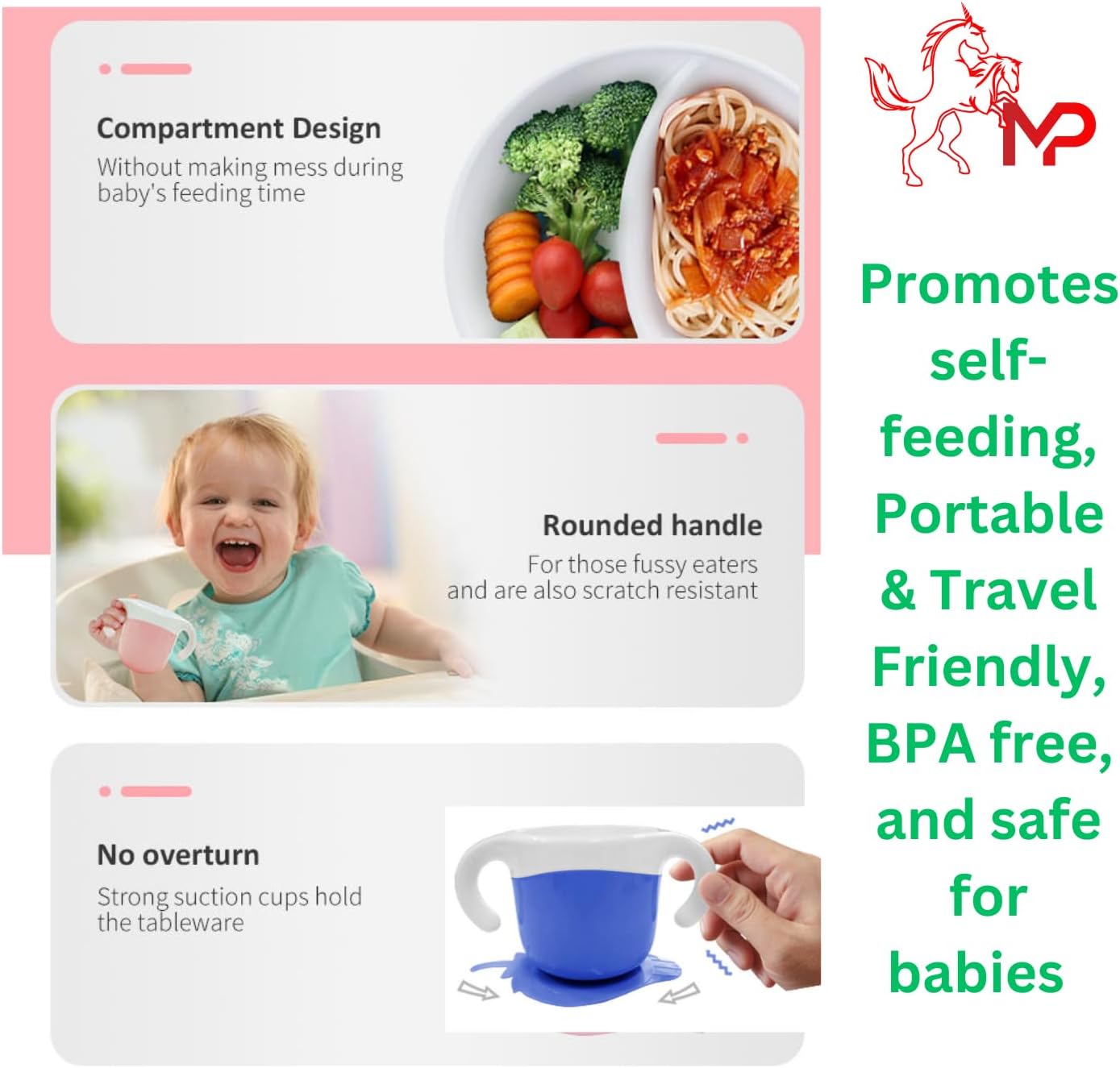 MATERIAL: Our baby feeding set is made of 100% food-grade silicone free of BPA, lead, and PVC so that it is absolutely no harm to the baby’s health. Our baby plate and bowl set is a must to help the transition of eating from highchair to table making your little angel feel a bit more grown up.