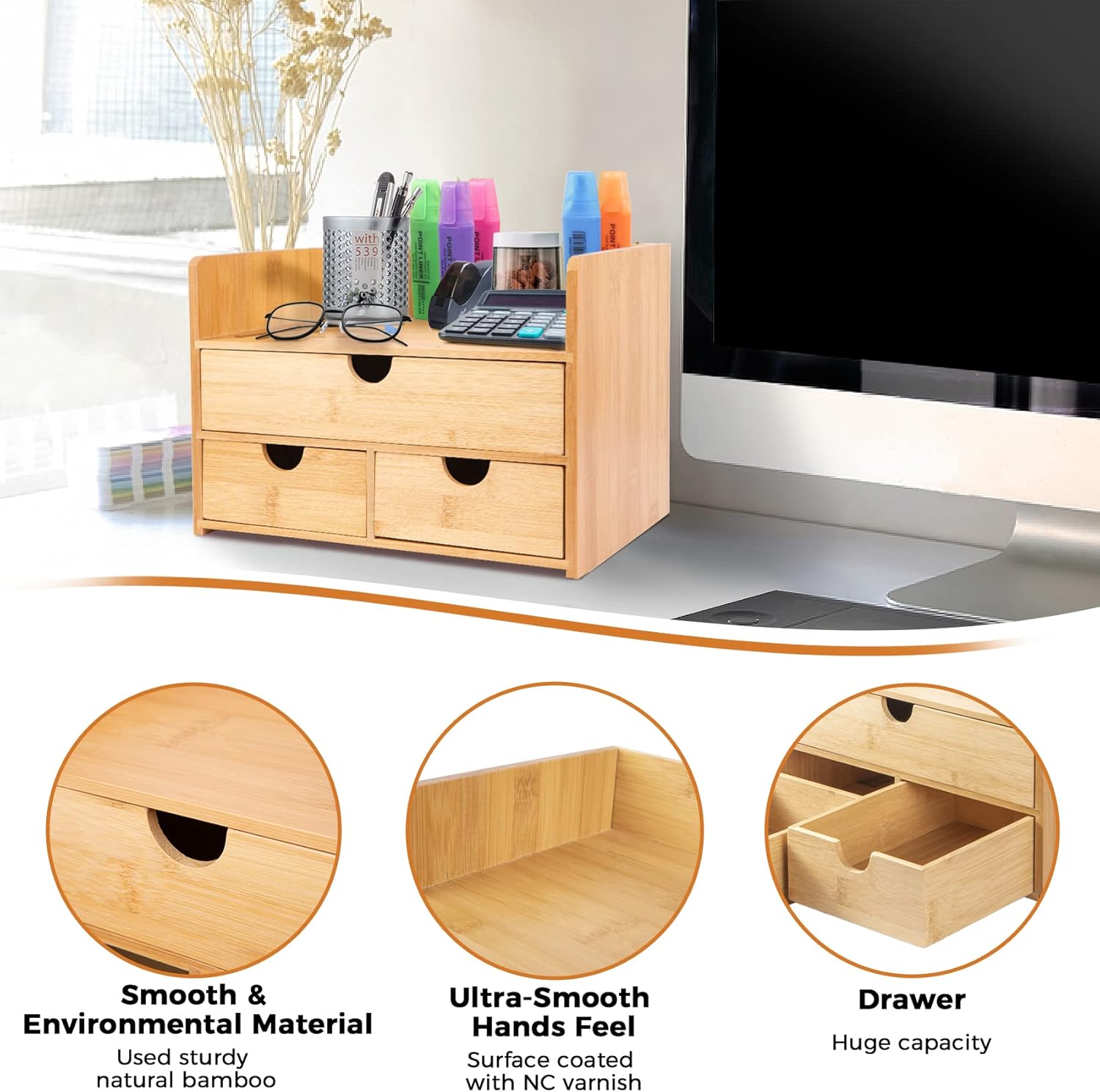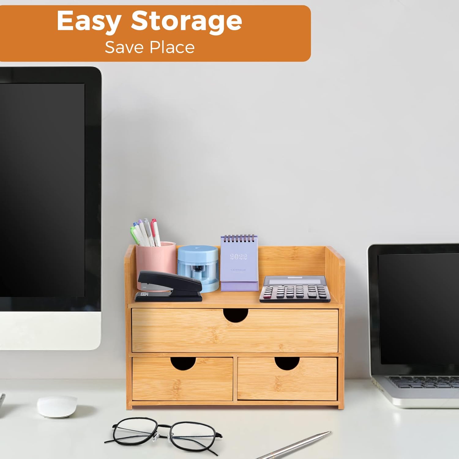STORE AND ORGANIZE EVERYTHING without having to settle for messy desktops. Perfect for your office desk or work-from-home office, this wooden desk organizer features 3 x handy drawers and an open shelf for storing all your office supplies.