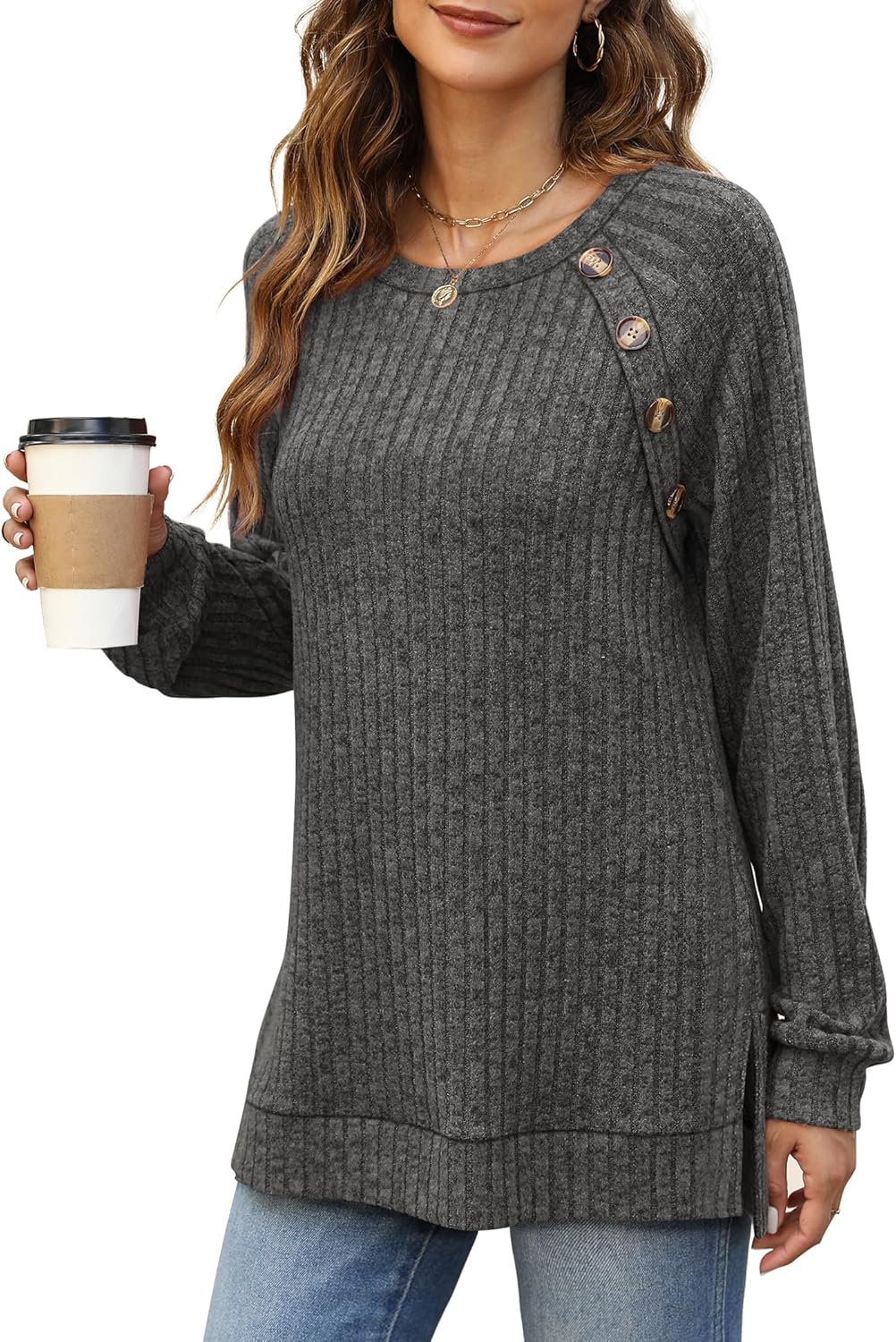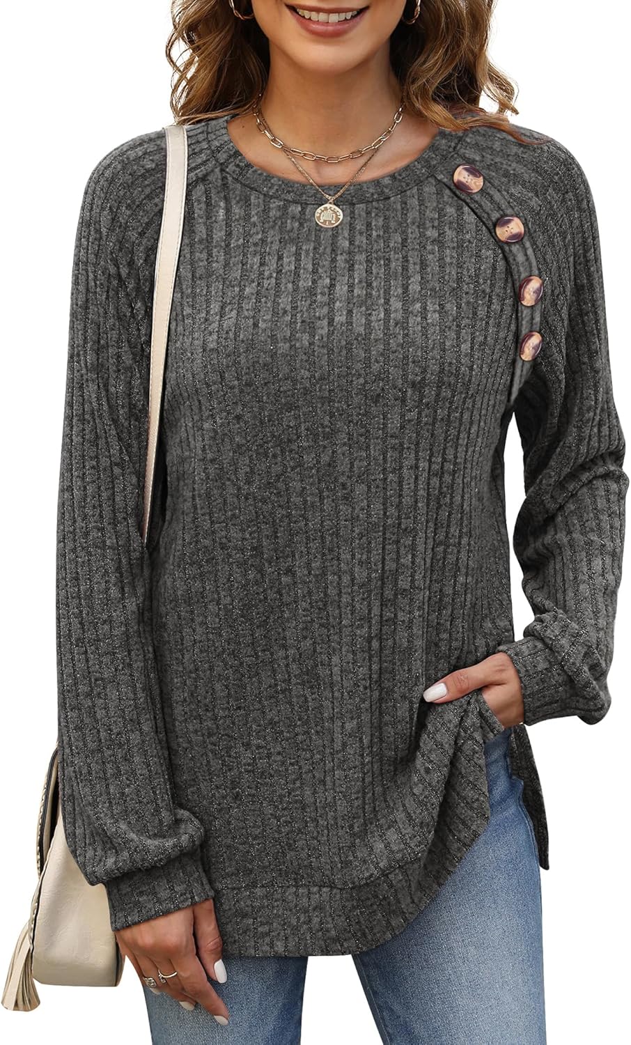 Womens Tops Long Sleeve Crewneck Lightweight Pullover Sweaters Button Decor