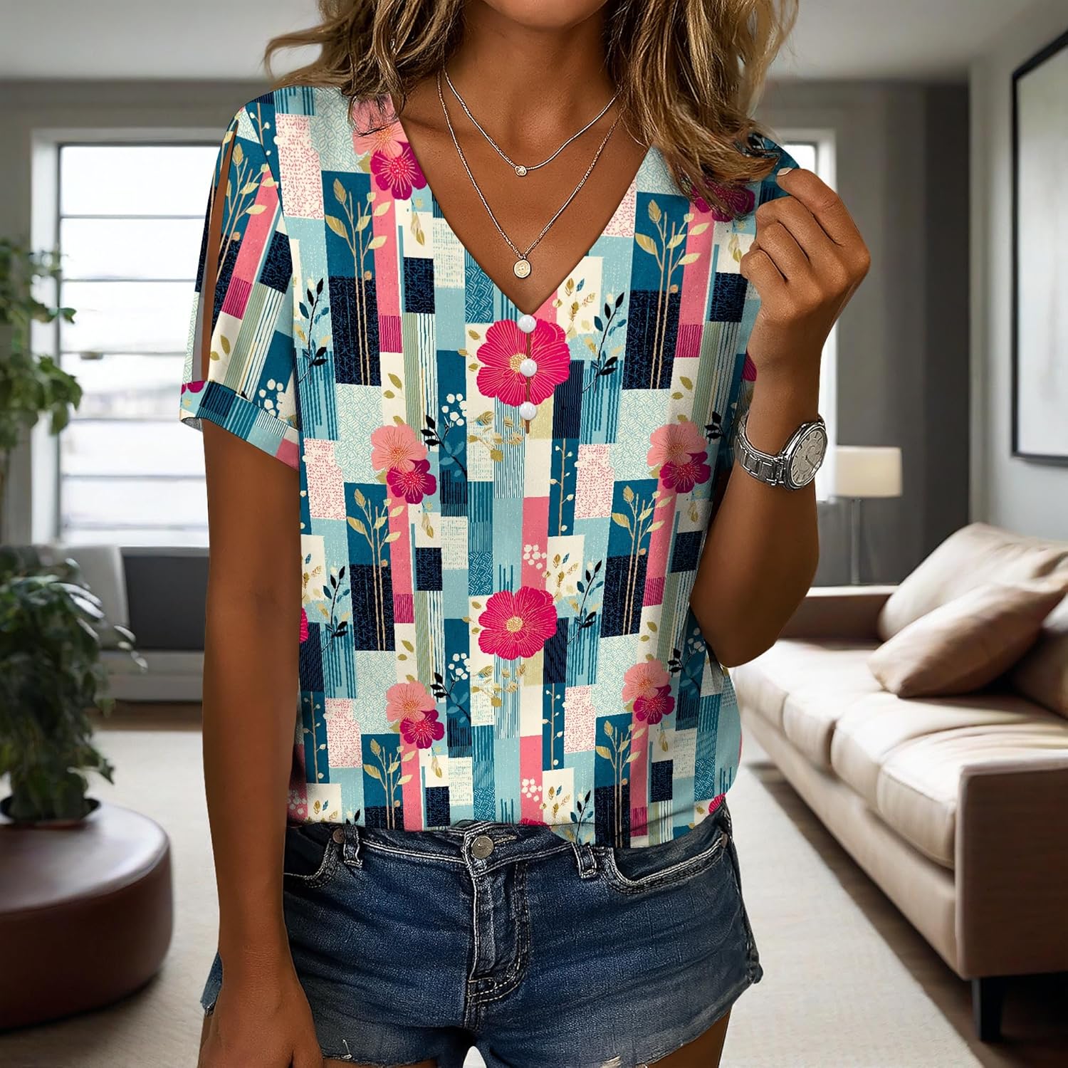 Boho Chic Women’s Floral Print V-Neck Short Sleeve Blouse Ladies Casual Cotton Linen Blend Button Tunic Top