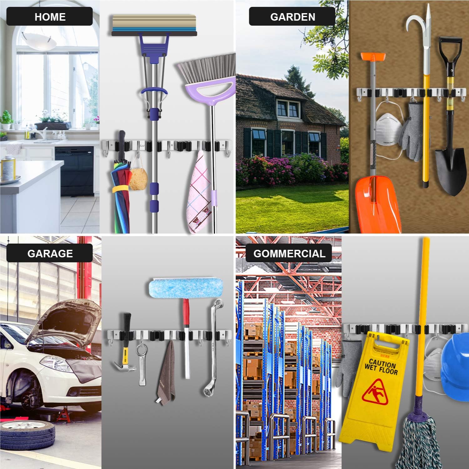 【MULTI FUNCTION】This storage rack with 4 Racks 5 Hooks can hold and hang brooms, mops, racks, keys, umbrella, brushes, dust pans, gloves, dusters, baseball bats,etc.