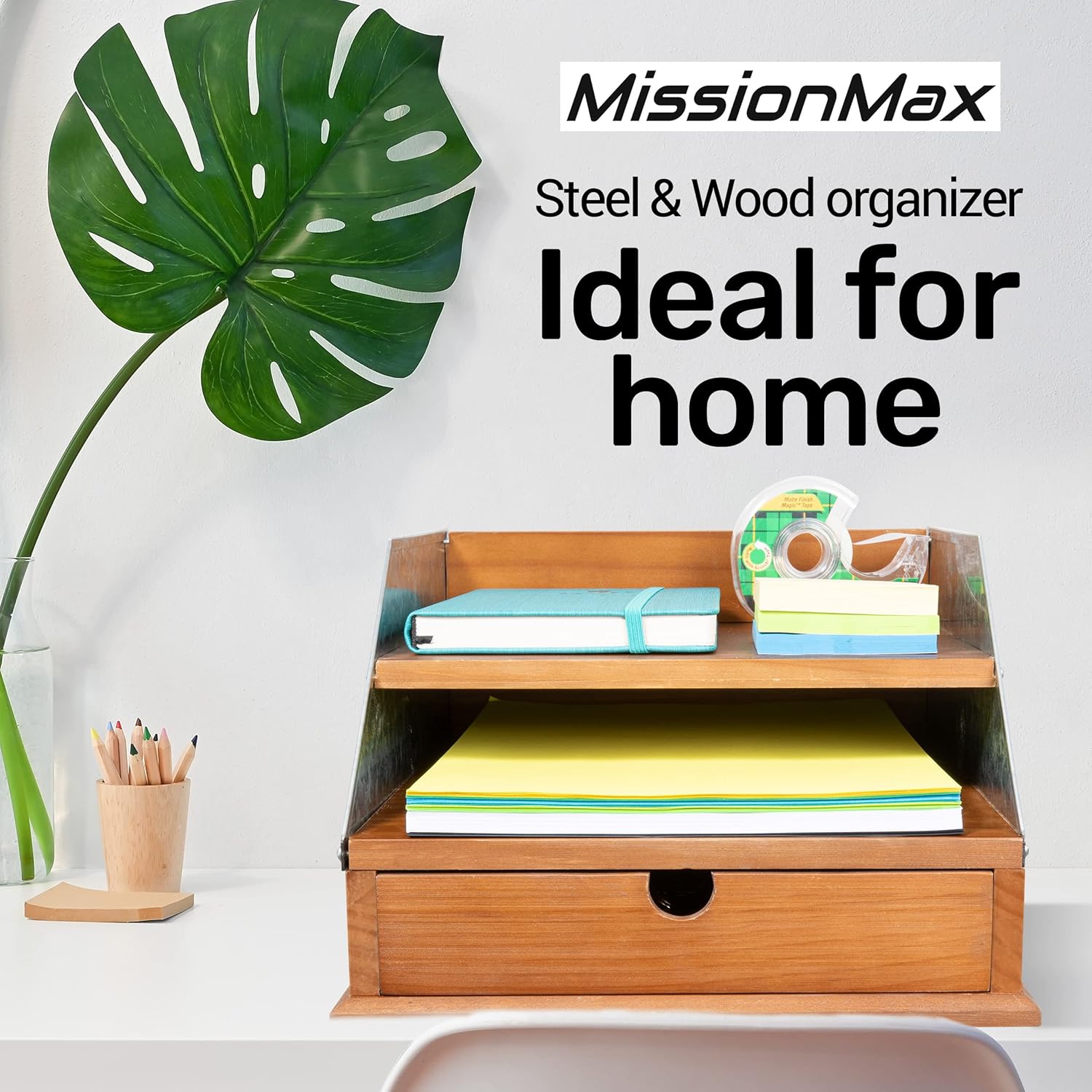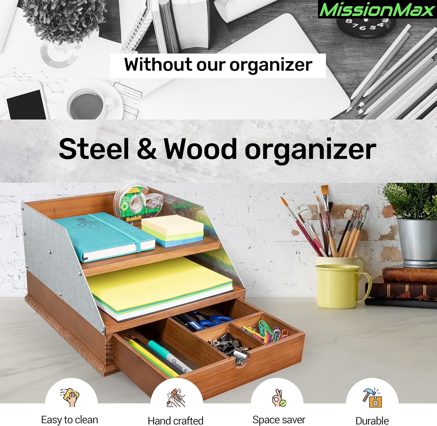 Our organizer is crafted with the ideal blend of wood and spangled steel