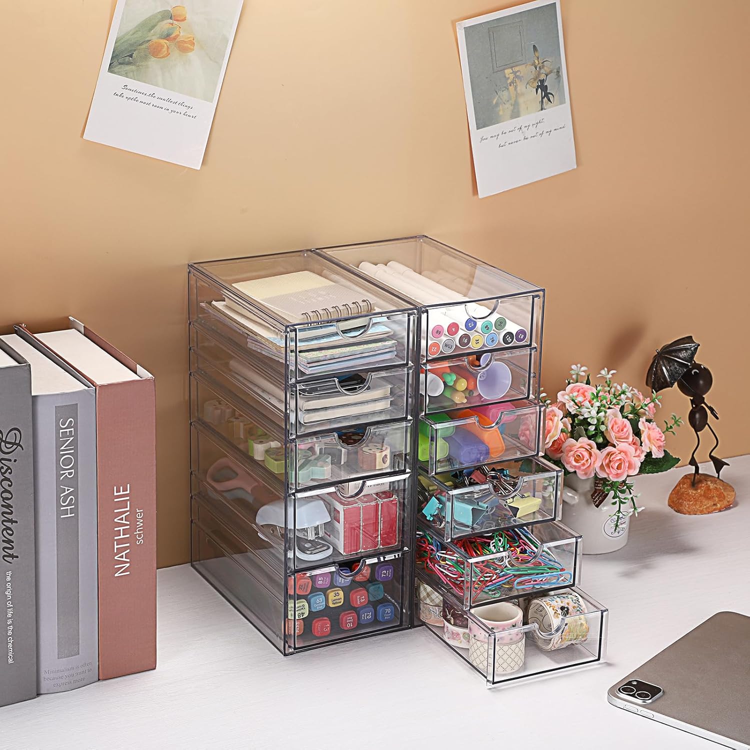 BTSKY Plastic Desktop Drawers, Clear Desk Storage Box, Stacking Desktop Organizer with 6 Sliding Drawers Desk Accessories Display Caddy for Vanity Stationery Art Craft Supplies, 6 Drawers