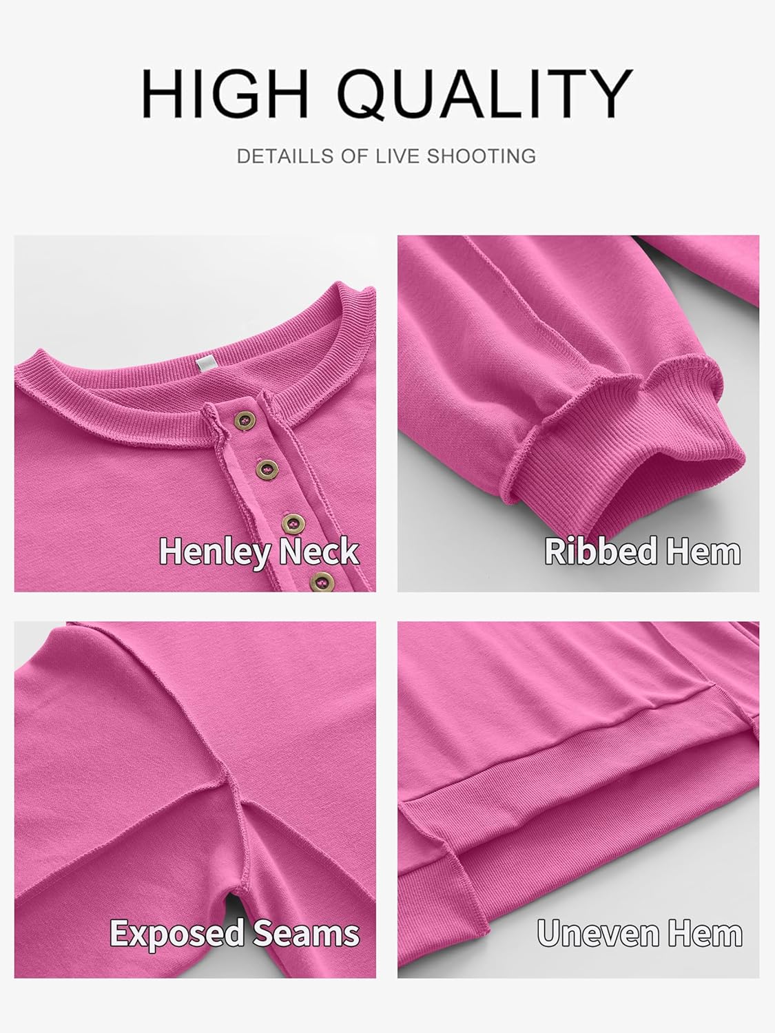 Designs: Henley neck, oversized fit, exposed accent seams, uneven hemline