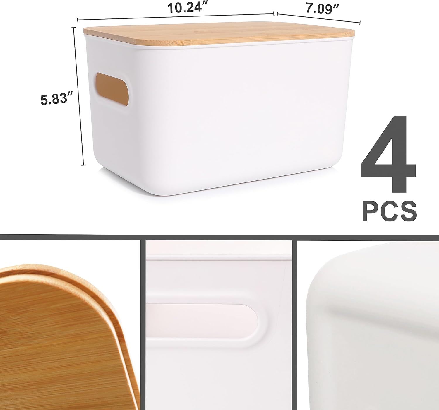 【Thoughtful Size】Package includes 4 plastic storage bins with bamboo lids, single measuring: 10.23″L × 7.08″W × 6.22″H.