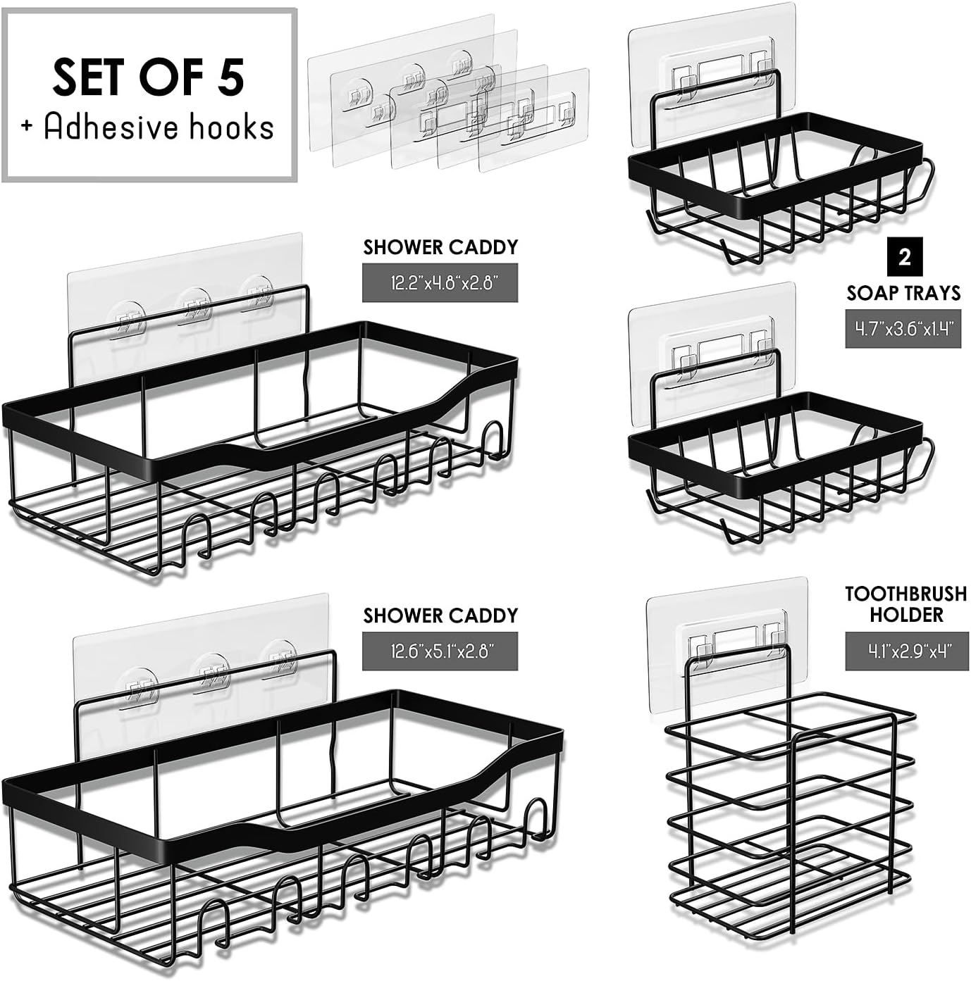 Complete Shower Shelf for Inside Shower Set: The set includes two shower caddies, two soap trays, one toothbrush holder and adhesive hooks, providing ample storage and organization for all your shower essentials. The extra strong adhesion ensures a secure hold on smooth surfaces.