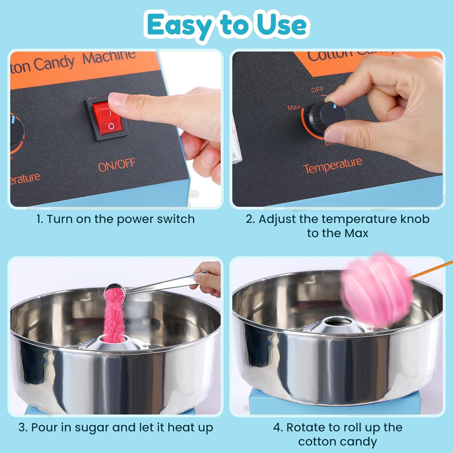 Turn on the power switch.Adjust the temperature controller to Min~Max and preheat for 3 minutes.Pour sugar into the spinning head.Rotate to roll up the cotton candy with a stick(sticks are not included).