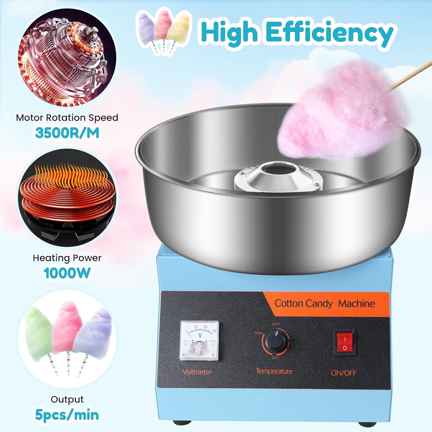 Our cotton candy maker has a production capacity of 5 pcs per minute, making it an excellent fit for your commercial plans and parties.The candy outlet can hold about 4oz. of sugar, which avoids repeated filling.Commercial Cotton Candy Machine can operate continuously for 1 hour, avoiding frequent shutdowns and cleanings, improving production efficiency.The scale displayed on the voltmeter is equivalent to the temperature.