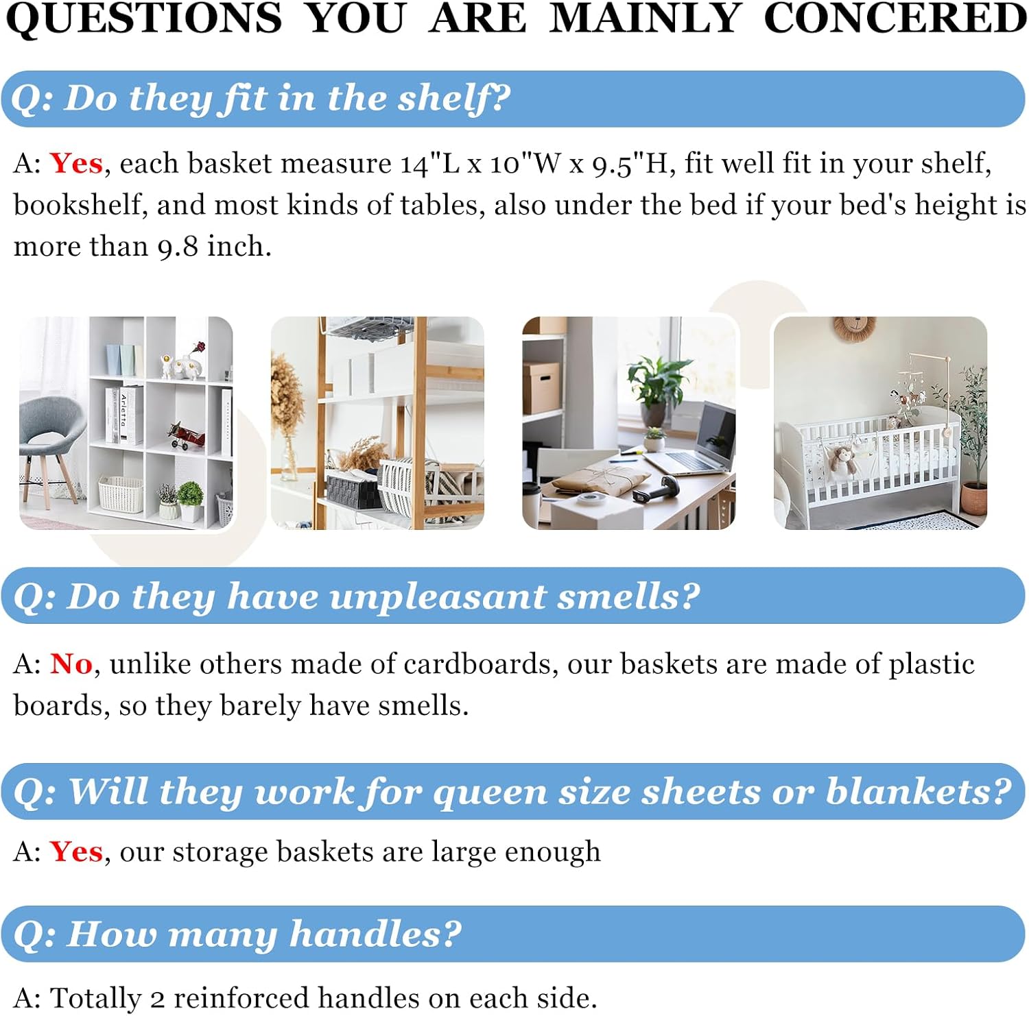 【PREMIUM QUALITY】 These bins for organization are made of stiff plastic boards on all sides and bottom, so these storage cubes could remain sturdy for years, stackable, and odorless in enclosed space. Durable non-woven fabric ensures these organizer baskets long-lasting. The organizer bin is stitched with 2 handles for a firm grip and easy carrying.