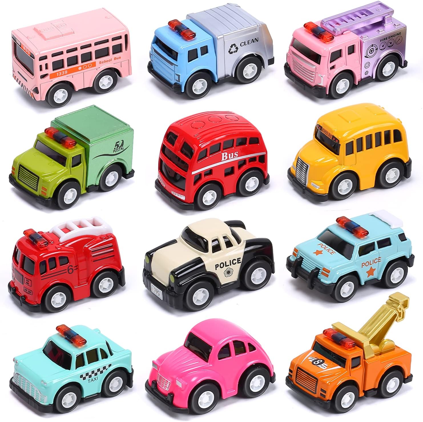 Collection of 12 Pull Back Alloy Cars: Features 12 colorful pull-back cars designed to captivate children’s curiosity. These cars, approximately 1 inch in size, are ideal for small hands and are specifically designed for children. They operate without batteries; simply pull back and release to watch them zoom forward.