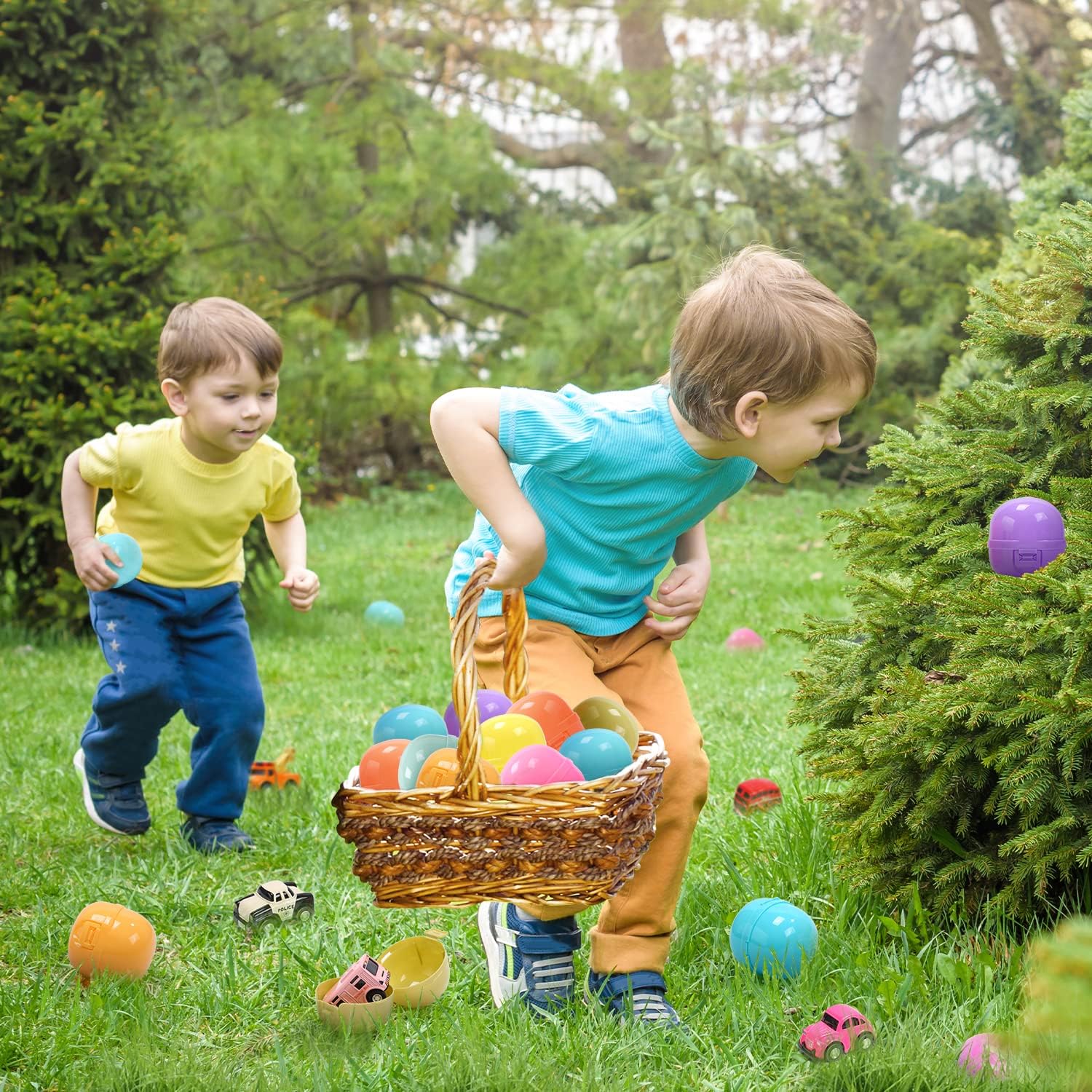 Vibrant Prefilled Easter Eggs: This set includes 12 Easter eggs, each measuring 2.6 inches, in 6 assorted colors. Each egg contains one of 12 different mini vehicles, with the egg and car colors being randomly matched for added surprise.