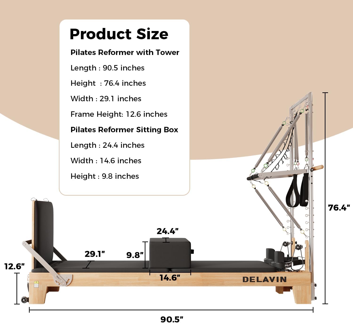 DELAVIN Wooden Pilates Reformer With Tower, Machine and Accessories – Box, Padded Jump Board, Up to 220 LBS Weight Capacity