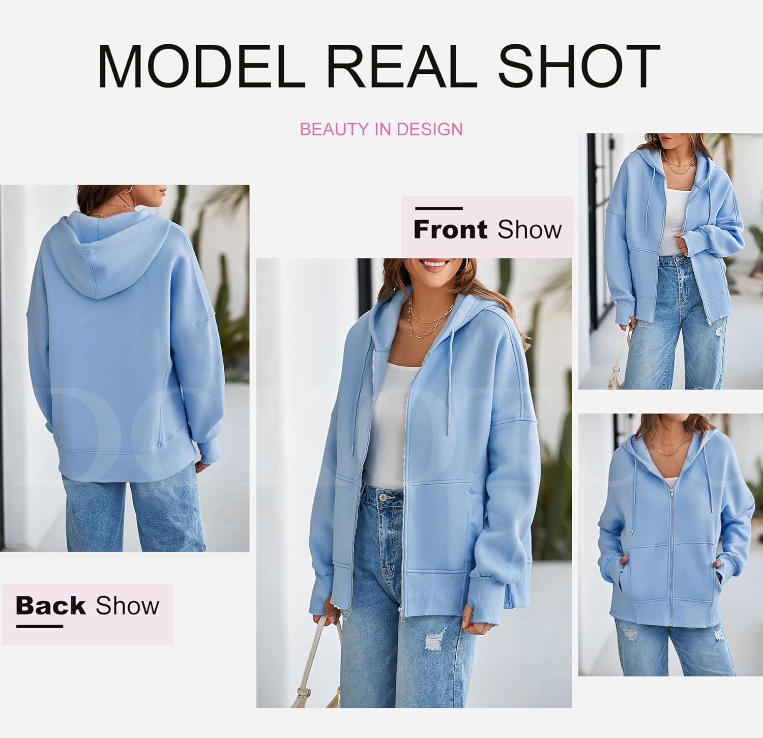 Dokotoo Womens Fleece Hoodies Loose Fit Drawstring Full Zip Up Fall Outfits Cozy Long Sleeve Hooded Oversized Sweatshirts for Women Solid Ribbed Cuff Warm Coats Jacket with Pockets M Sky Blue