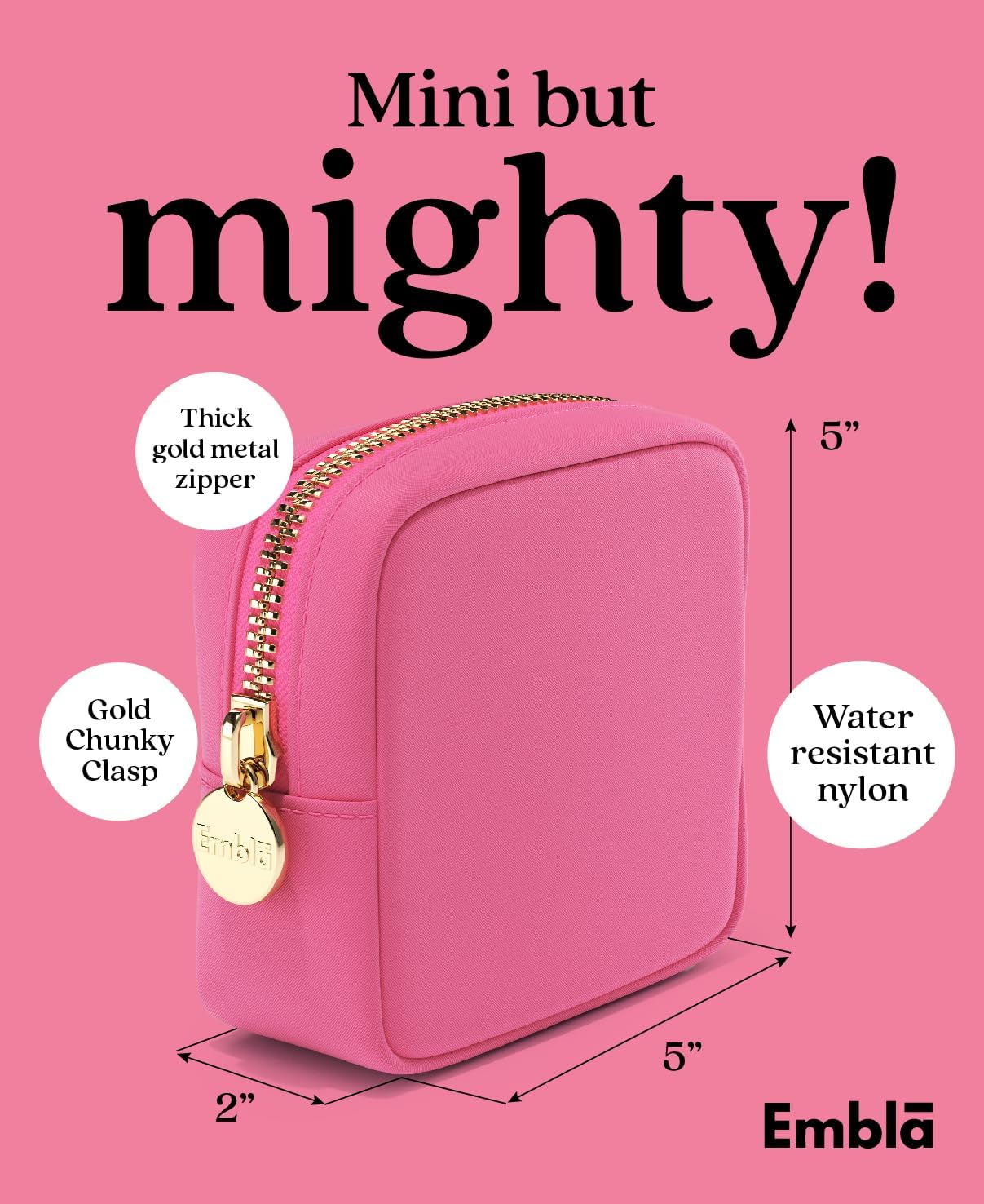 Compact and Lightweight Cosmetic Bag – The Embla mini travel makeup bag measures 5 x 4.75 x 2 inches making it the perfect size to carry and organize all of your beauty essentials including your makeup, make up brushes, eye liner, hair ties, lip gloss, perfume and other items, while small enough to easily carry in your purse, tote, gym bag, shoulder bag, backpack or pack in a carry on suitcase. Great makeup pouch for travel or daily use.