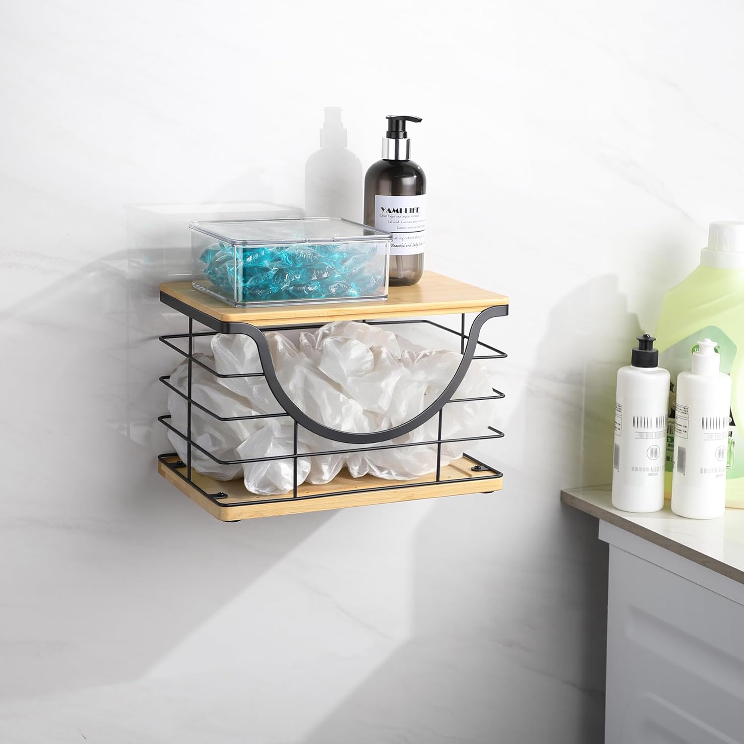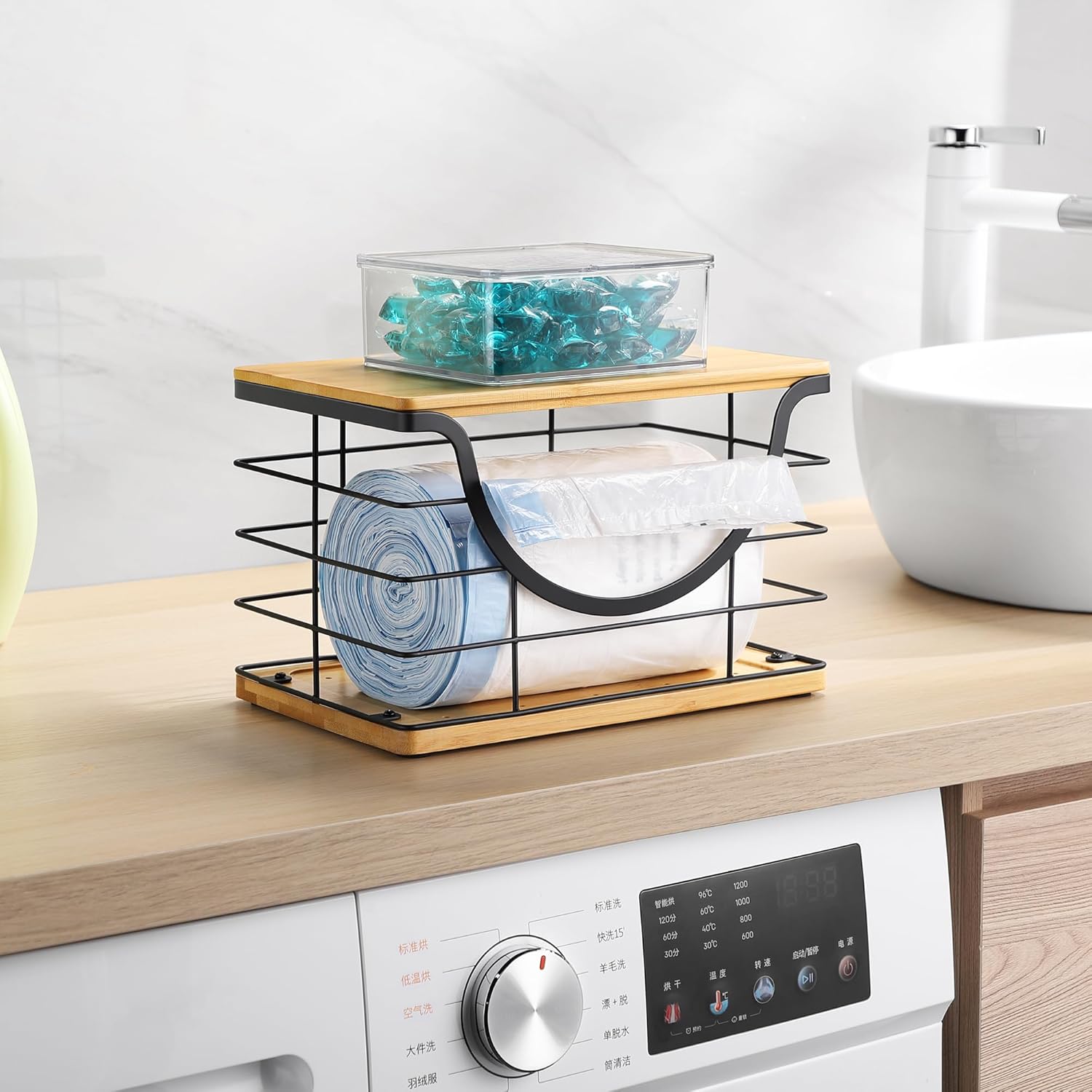 Practical and Space-saving – no assembly required. trash bag holder dispenser has a large front opening and a removable bamboo lid for easy access to items. In addition, other items can be stacked on the bamboo lid to save more space