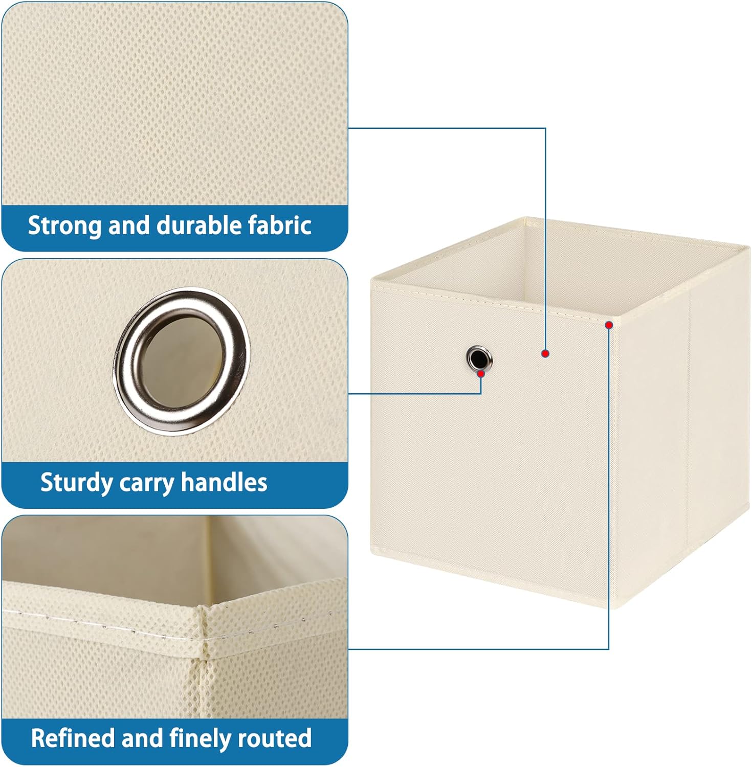 【Rugged Cube Storage Organizer】heavy cardboards added at the sides and bottom to make this storage bins rigid,Round metal grommets can easily pull out collapsible cube storage bins from high places for easy taking out or storing items.Dimension:11 “x 11 ” x 11″