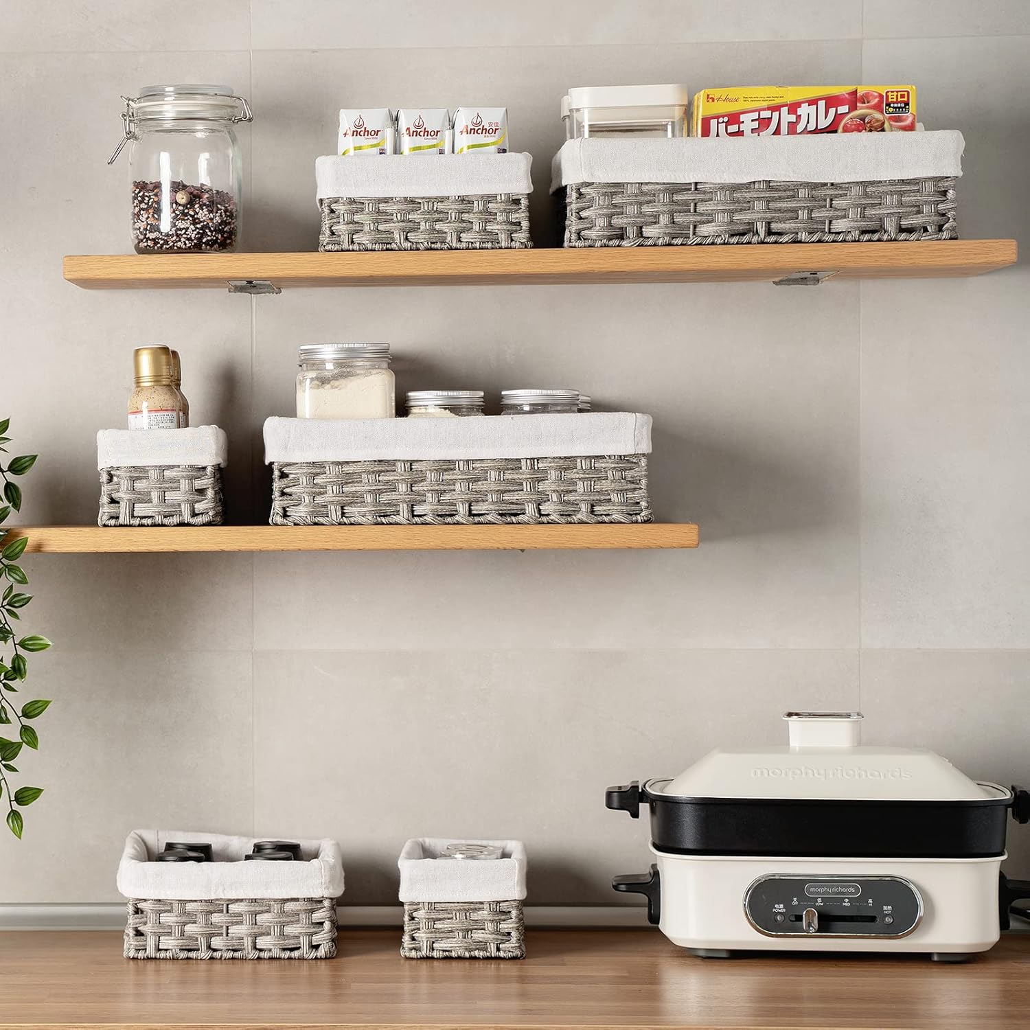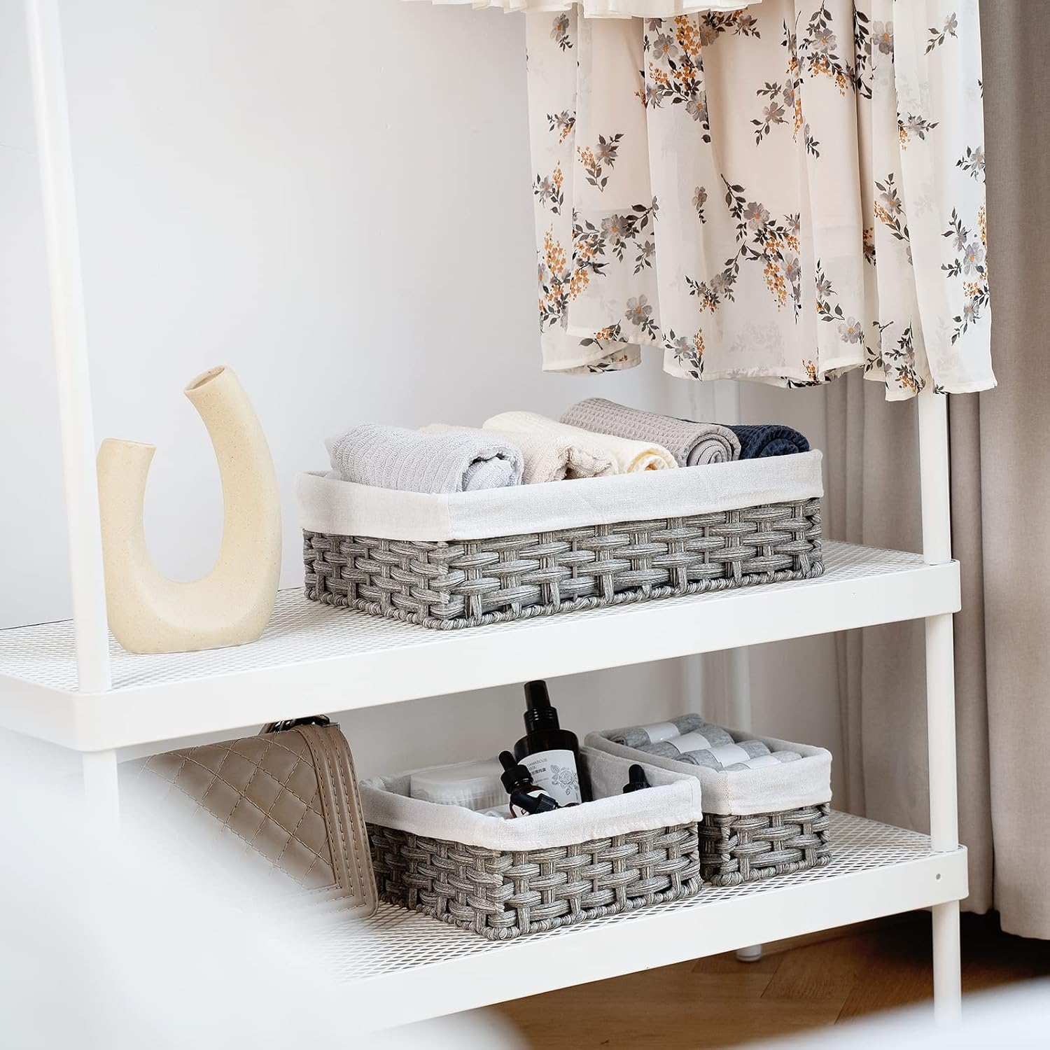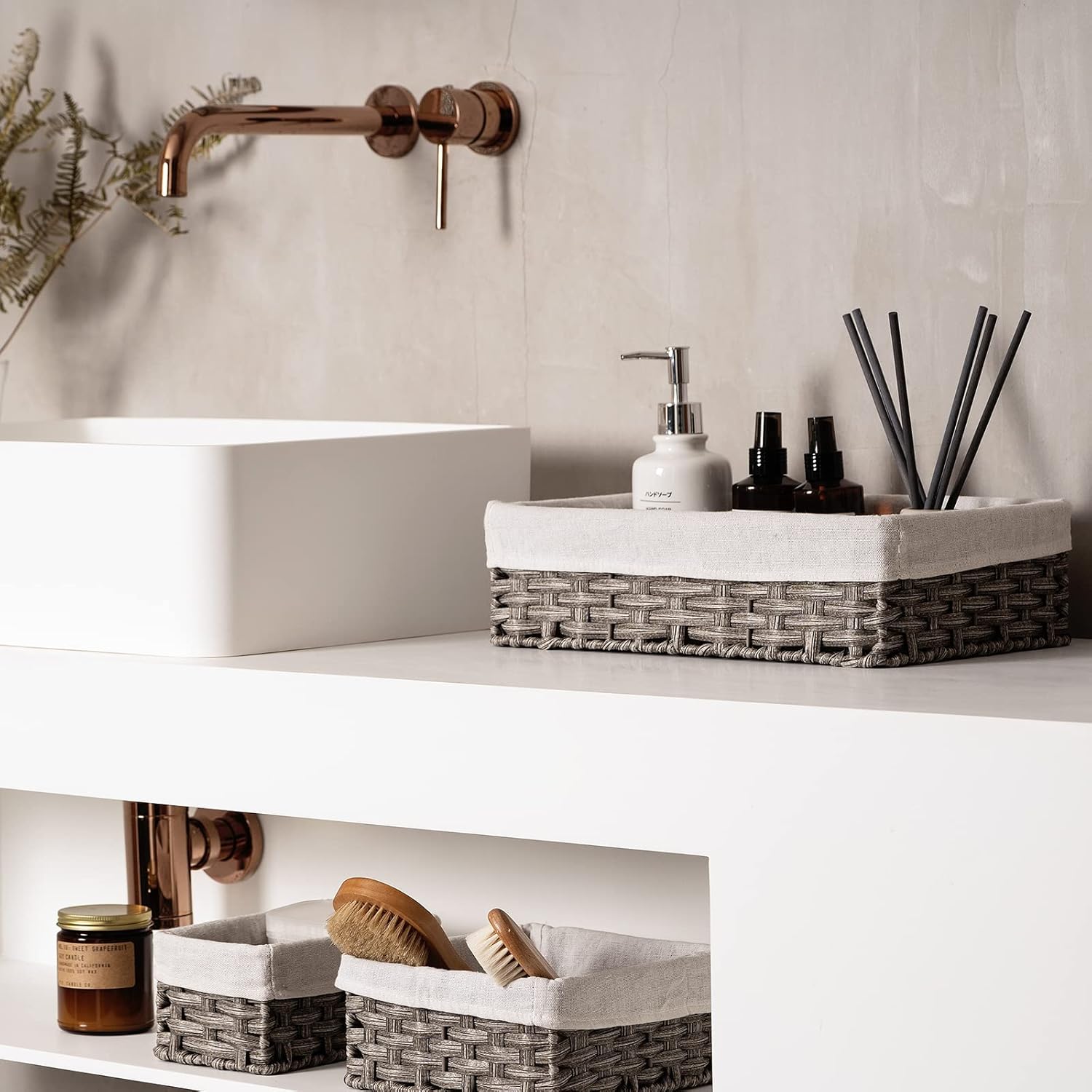 Waterproof Material & Removable Liner: Small wicker basket made of durable plastic, which is water-resistant, durable and easier to clean. Wicker baskets for organizing featured with Liner, which is removable and washable, convenient for daily use. (Please note: the liners are packed inside, please take out the 2 smaller baskets and put liners into suitable wicker baskets.)