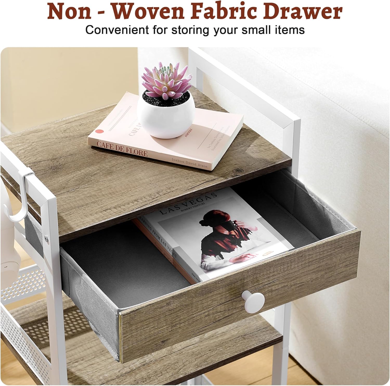 One Removable Fabric Drawer: The bathroom table stand with an additional fabric drawer which is light and soft, to store hair clips, combs or other personal items, makes full use of vertical space to keep your home, office, apartment tidy and organized. Comes with 2 hooks, perfect for hanging towels.