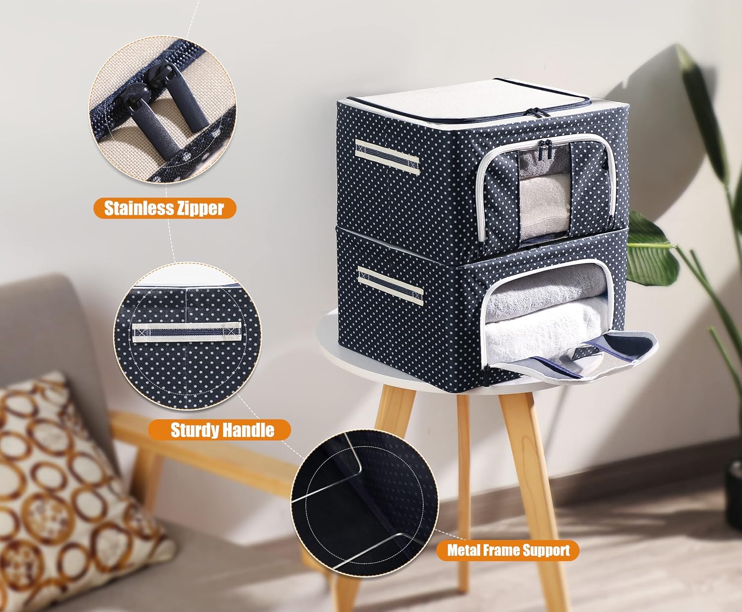 Furnhome Clothes Storage Organizer Bins Containers, Stackable and Foldable Oxford Cloth Steel Frame Storage Box for Clothing Storage with Clear Window & Reinforced Handles (Navy Dots, 22L,3PCS)