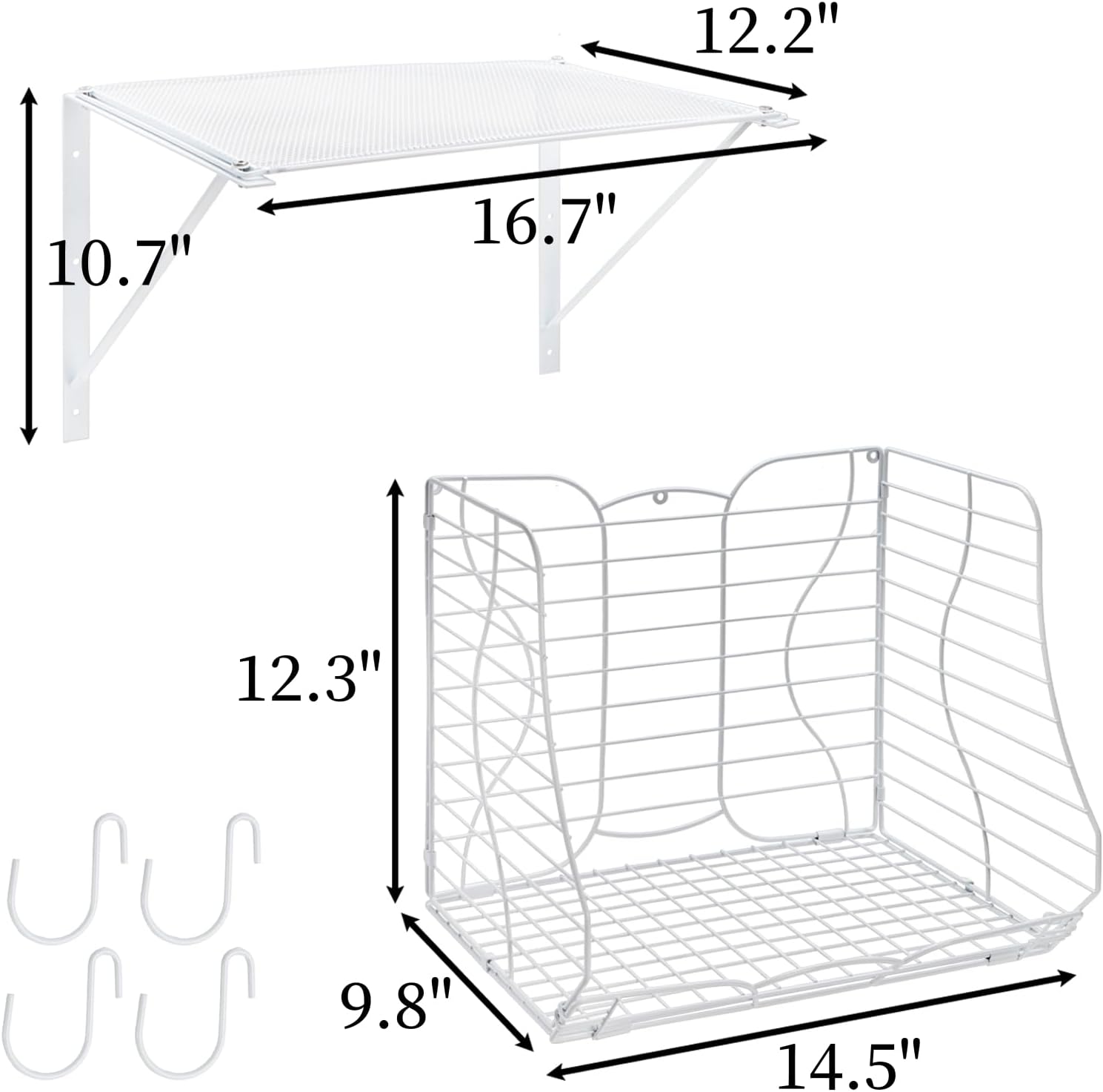 Large Storage Capacity: You will get 2 laundry room shelves, 2 hanging baskets, and 8 metal hooks. Not only can you conveniently hang your clothes, but also can neatly place your laundry supplies. (Size: The shelf is 16.7″L*12.2″W*10.7″H; the basket is 14.5″L*9.8″W*12.3″H)