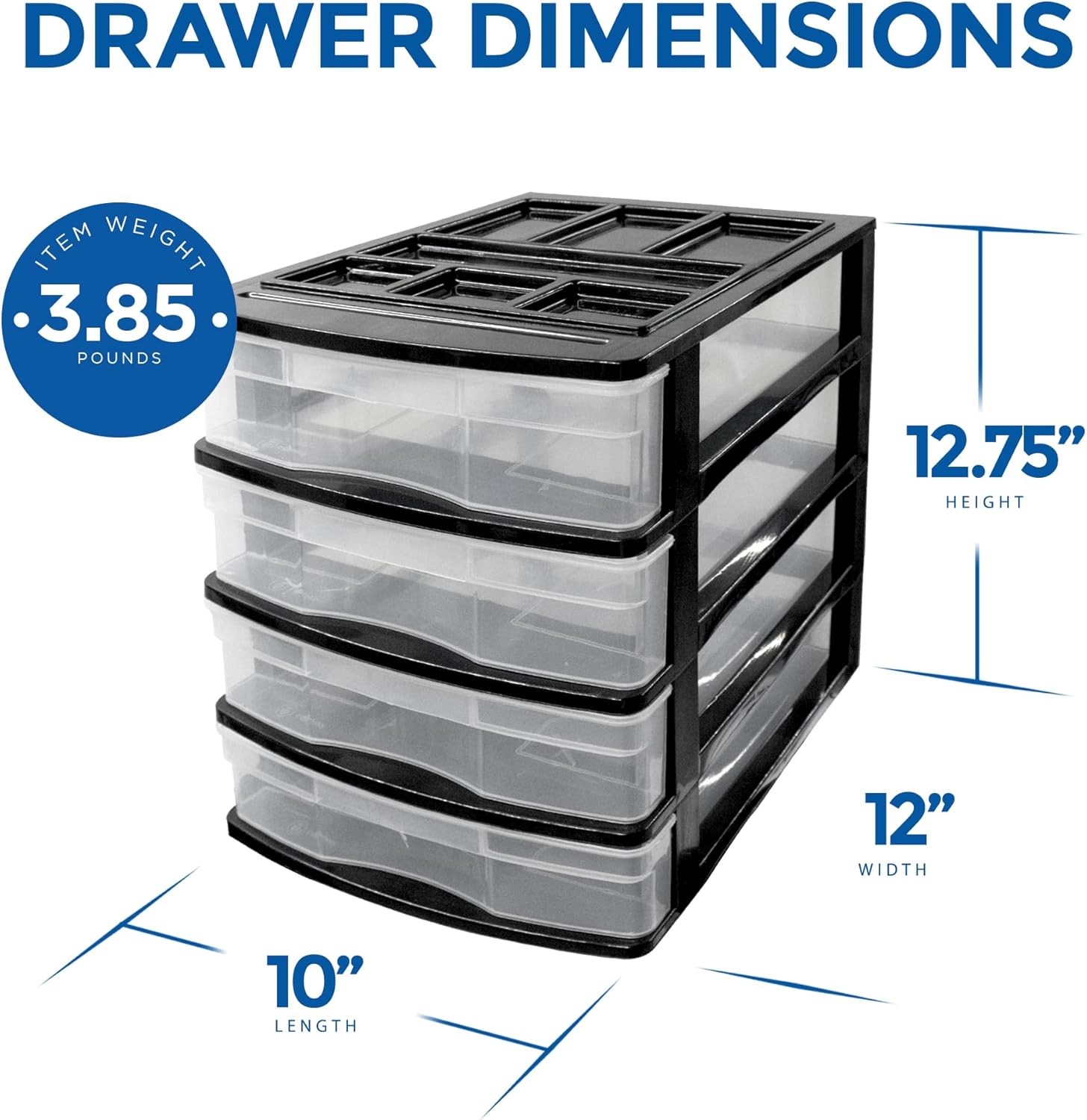 Storage Drawer Set: Each of the 4 pull-out drawers in this tabletop storage set measures 8 1/2″ W x 11″ L to fit office supplies, makeup, paper, and more. Unit dimensions: 12″ L x 10″ W x 12 3/4″ H.
