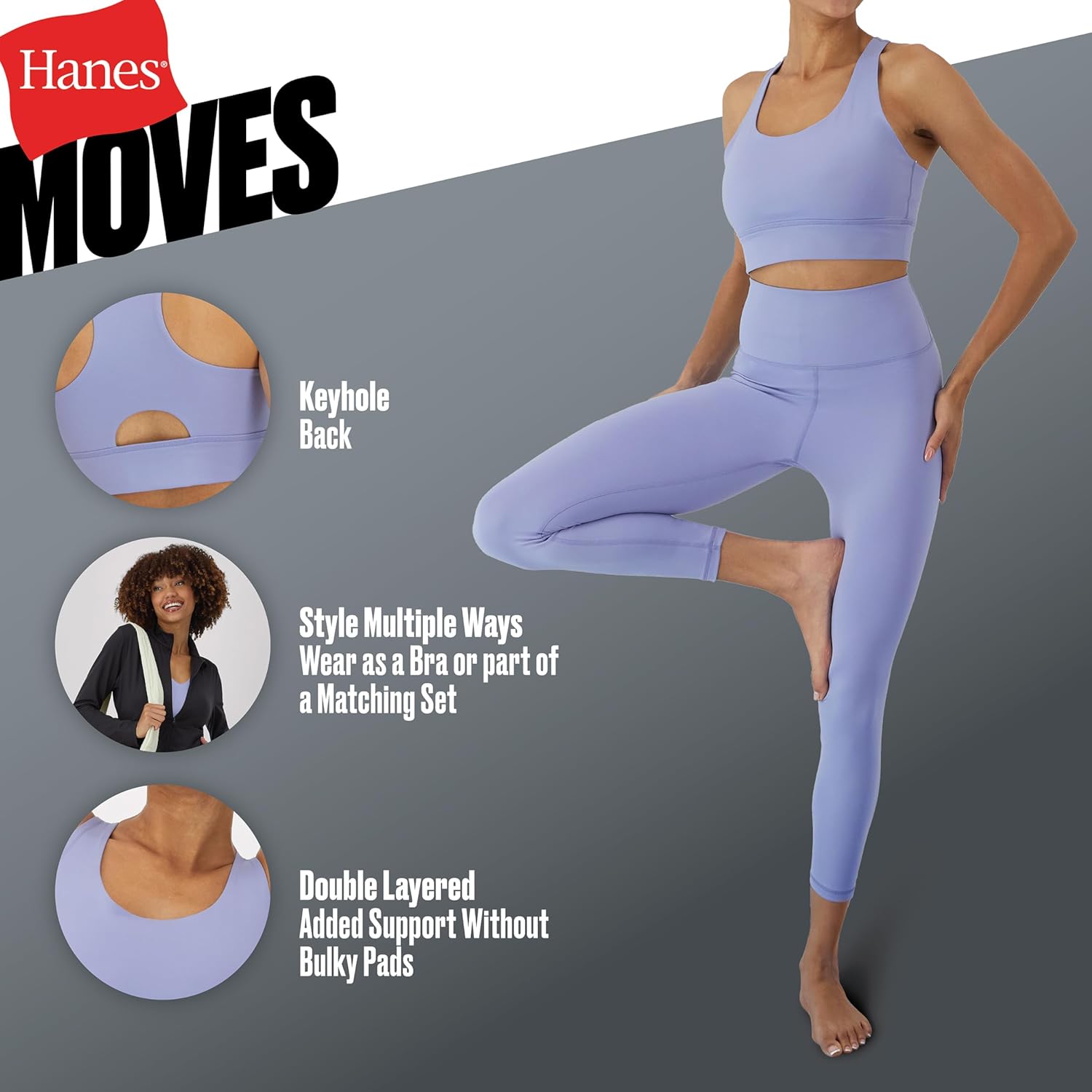 This women’s racerback crop bra from the Hanes Moves™ collection smoothly combines sporty aesthetics and a laid-back vibe – making it a perfect choice whether you’re working up a sweat or not. Crafted from peached interlock fabric, this racerback bralette offers an exceptionally soft and luxe feel. Four-way stretch and moisture-wicking technology enable you to take on any activity. A fabric-backed elastic band offers additional support. Perfectly suited for layering (or not), you can pair this women’s crop top with leggings, bike shorts, or joggers for a simple, ready-to-wear look. Hanes Moves. Ready for anything.