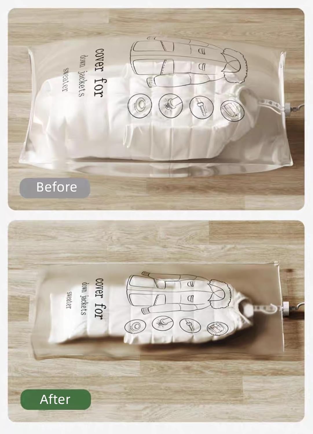 Versatile and Space-Saving: Perfect for home organization, travel essentials, or relocation needs. These vacuum-sealed storage bags are ideal for storing a wide range of items, from bulky winter jackets to cozy comforters, helping you conserve valuable space in your home