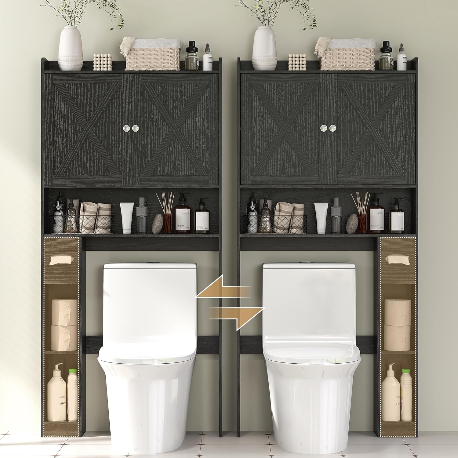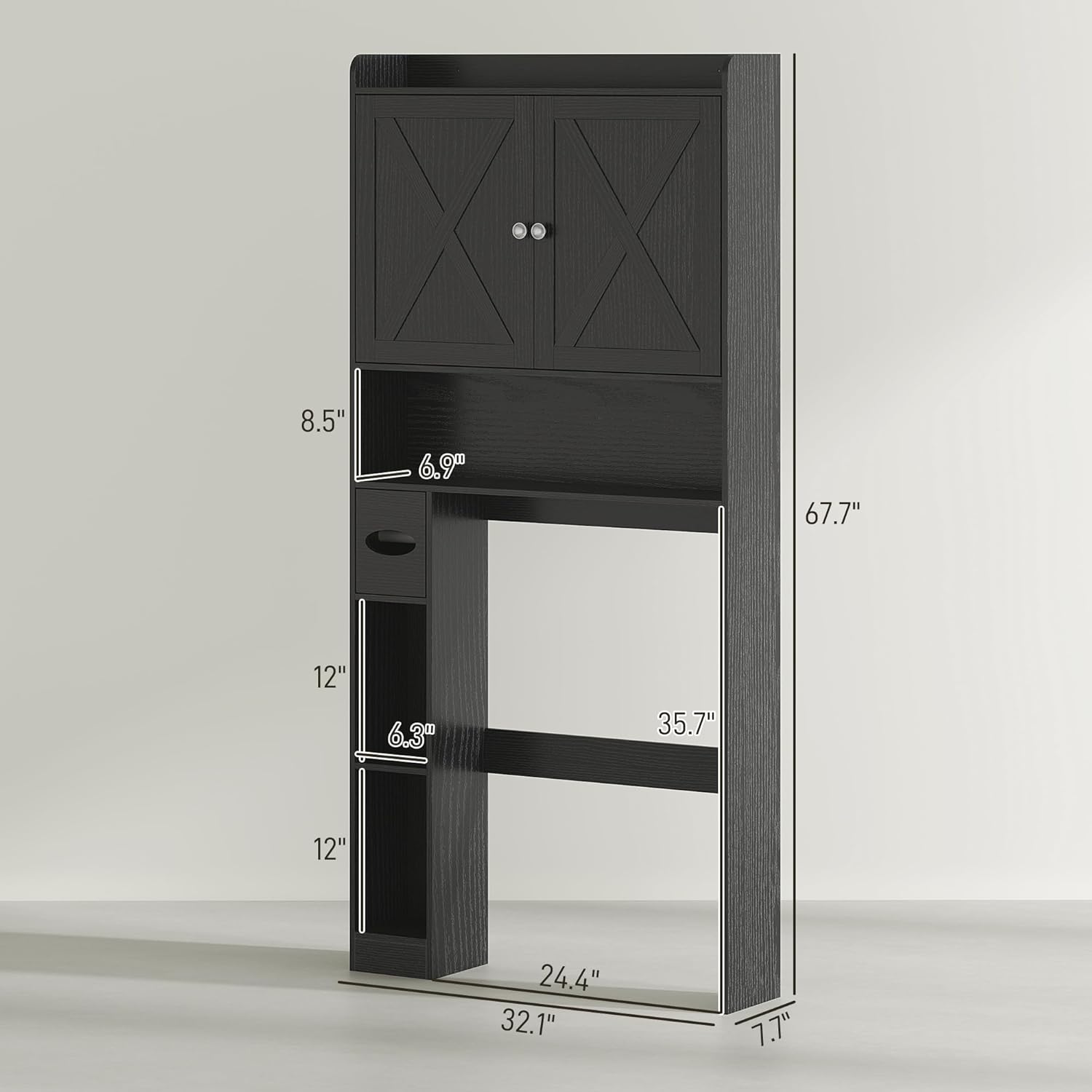 A three-level adjustable shelf behind doors conceals toiletries of different heights A safety top shelf, three open compartments, and a paper roll cabinet for convenience X-shaped barn doors with wood grain add farmhouse charm Left or right-mounted bottom storage meets your needs Bathroom space saver frees up valuable floor space 24.4″ x 35.7″ bottom space is suitable for most toilets or washing machines Anti-tipping kits ensure safe and stable use Easy to assemble with numbered parts and clear instructions
