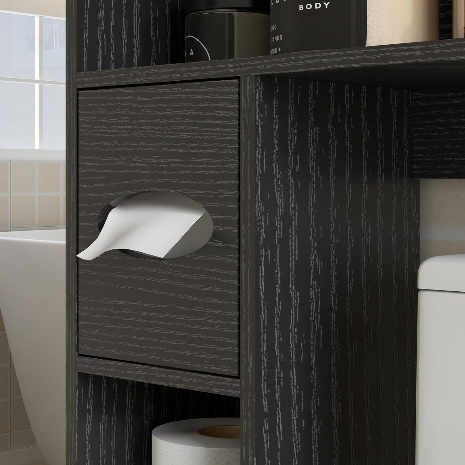 Spacious Storage Space: Our over-toilet bathroom organizer features an enclosed two-tier shelf to conceal your skincare products, three open compartments to keep your daily essentials within reach, and a specially designed cabinet for a paper roll