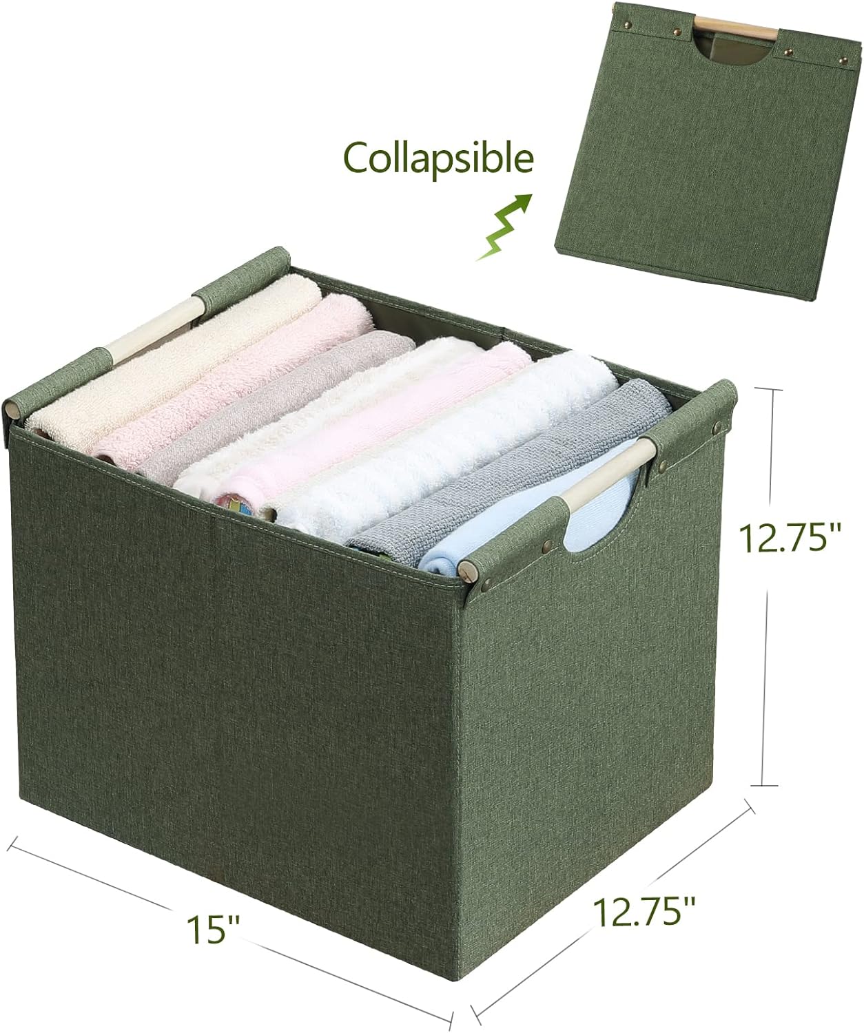 Materials and Dimensions: measuring 12.75″ H x 12.75″ W x 15″ L, these durable foldable storage bins are made of top-grade lightweight linen fabric, with a 2.2 mm pressboard base insert to maintain shape and strength.