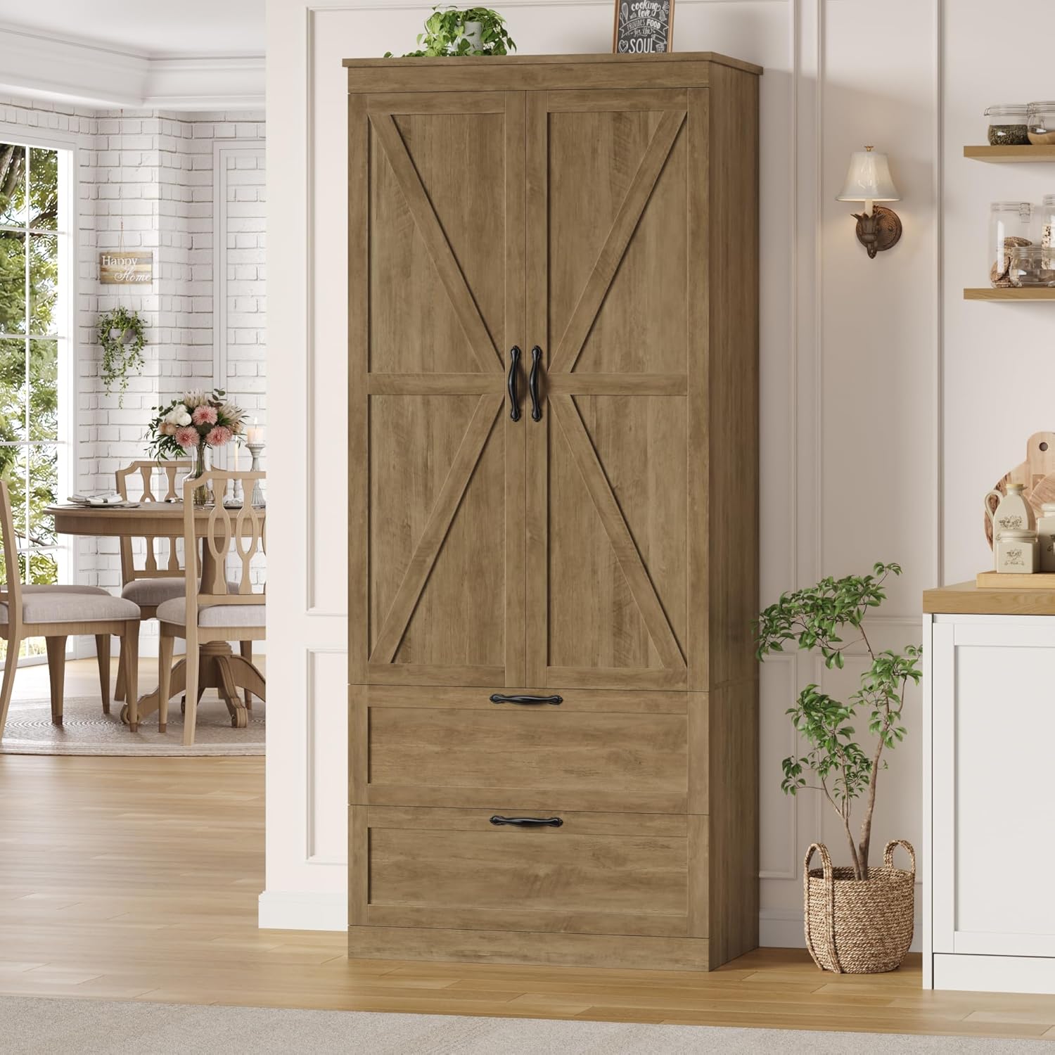Modern Farmhouse Charm: This kitchen pantry cabinet features a rustic brown finish, farmhouse barn doors and classic black metal handles in shape of flower, which creats a warm homey vibe and makes the cabinet an impressive focal point in your space