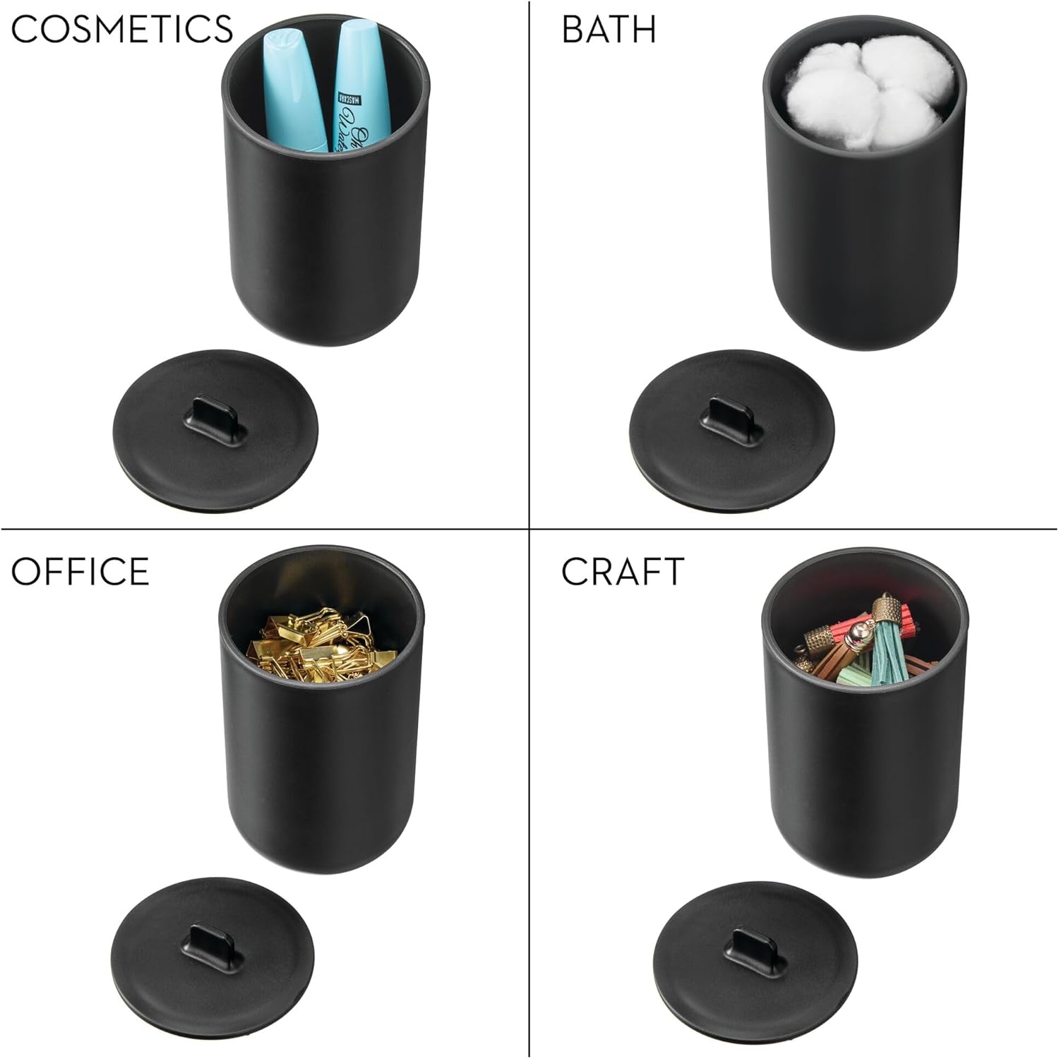Keep your bathroom countertops neat and tidy with the iDesign Cade Canister Jar with Lid. The sleek, black canister jar is similar to apothecary jars, and ideal for storing cotton balls, makeup and hair supplies, medication, and much more. Not just for the bathroom, it can be used in a dorm room, office, on a desk, and any space in a home that needs clear countertops. Measures 3. 14″ x 3. 14″ x 5. 09″. With iDesign, you can live simply and sustainably every day.