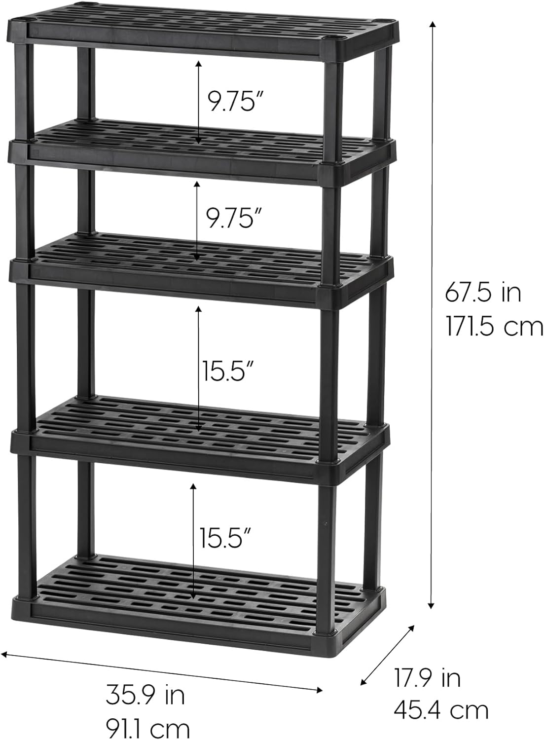 Tackle tougher messes and get organized with the IRIS USA 5-tier recycled plastic storage shelf! The fixed height shelving unit gives you a space-saving and convenient way to keep your stuff organized and within reach while the smooth matte black color easily blends in with the décor of any room in the house or garage. Use the shelving unit in the garage, pantry, basement, closet, entryway, shed, patio, utility or laundry rooms, or anywhere else where a simple yet sturdy shelf is needed. Each shelf on the solidly built and well-ventilated unit holds up to 100lbs per shelf, or 500lbs in total if the weight is evenly distributed between the shelves, and no tools are needed for this easy to assemble unit. Just avoid storing it in direct sunlight. Let’s make life a little more organized and a little easier.