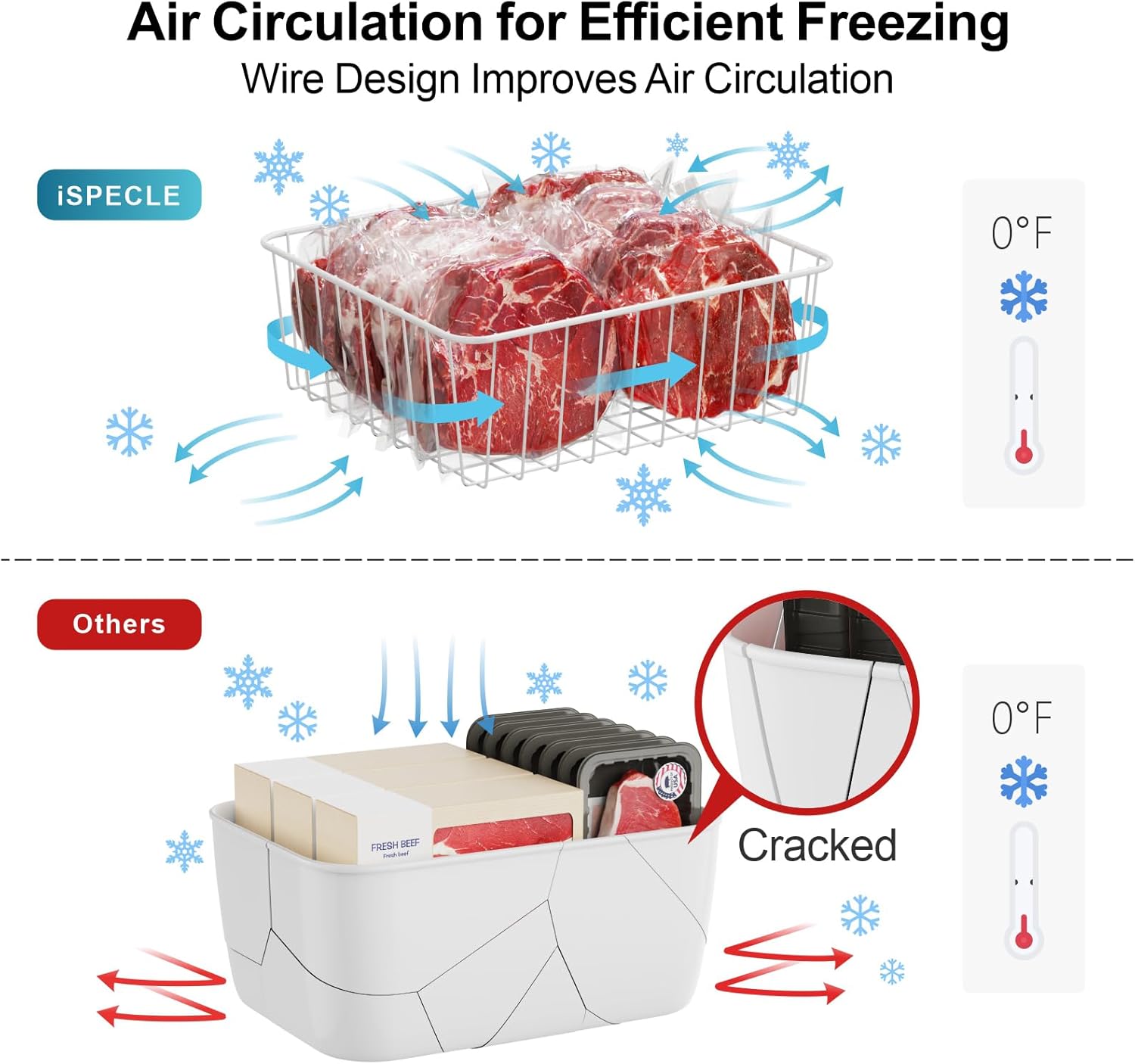 Yes, unlike the closed plastic bins, the open wire design does not block air flow, allowing cold air to circulate fully around the food for fast and efficient freezing, ensuring the freshness of food.