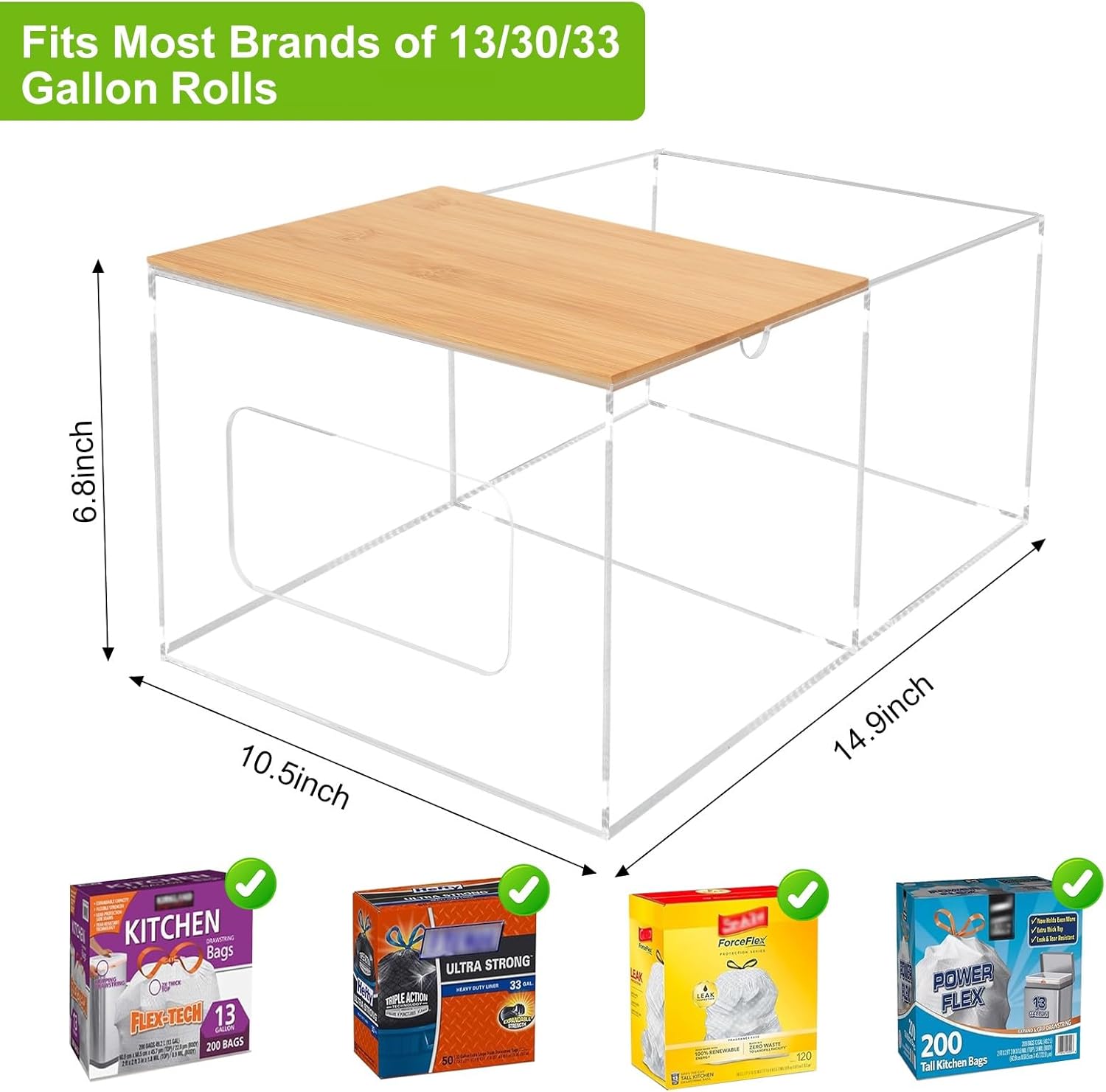 【STURDY & DURABLE】: Made from sturdy acrylic, the garbage bag dispenser features a clear design that allows you to easily see the contents and replenish the trash bags as needed. The top is covered with a bamboo lid, which can be stacked with more items for efficient storage. Simply lift the bamboo lid to add a new roll of garbage bags.