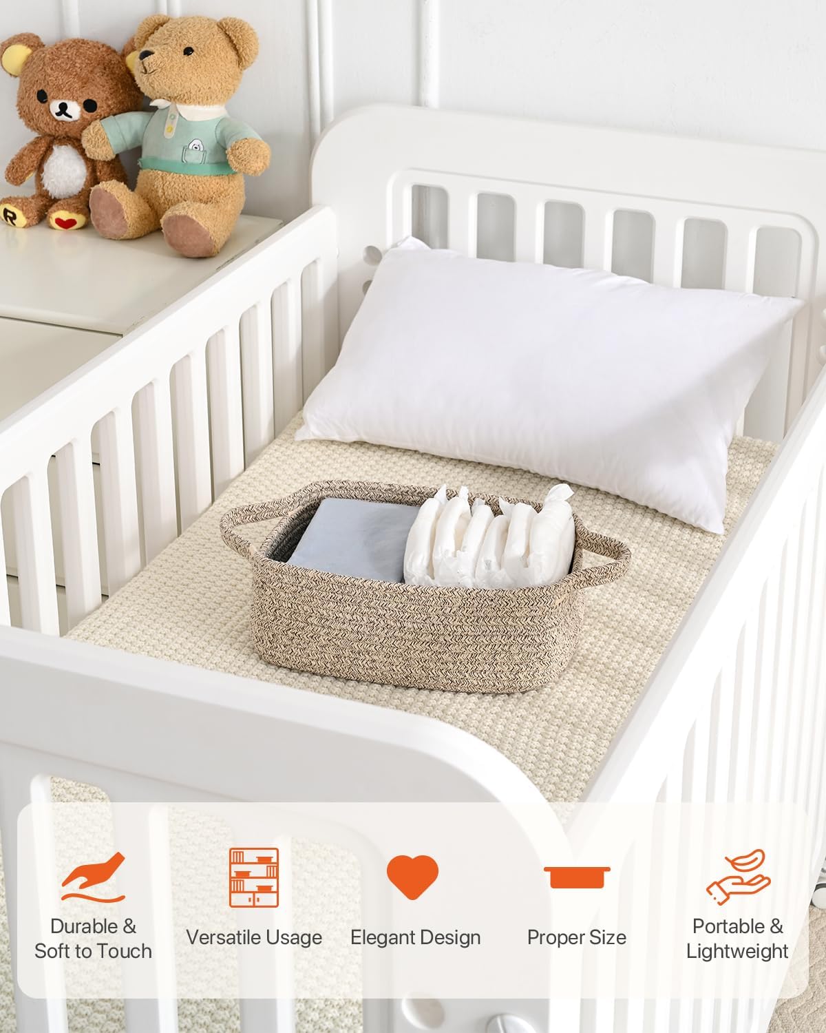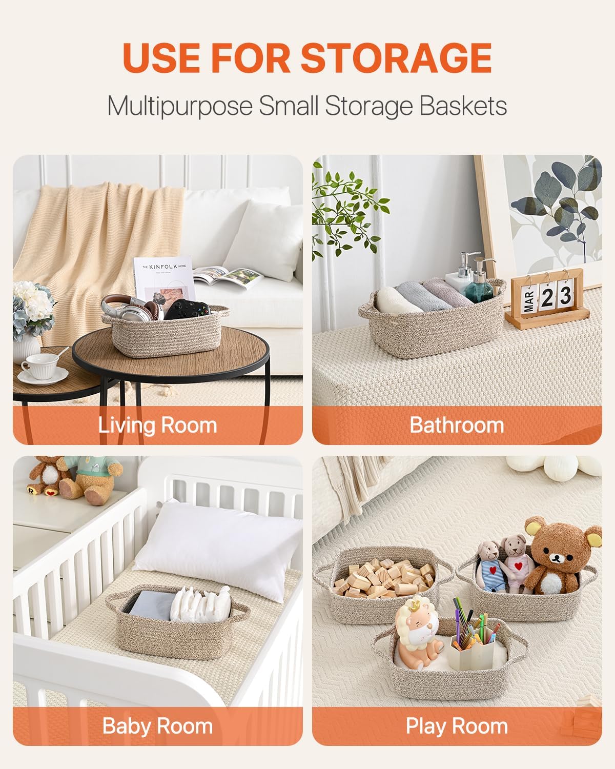 [ Multi-purpose Storage Basket ] Use it to organize towels, bibs, diaper, cat/dog toys, cosmetics, toiletries, remote control, keys, purses, snacks, office supplies and more. Whether used as a toy basket for the playroom, decorative baskets for shelves in the living room, bathroom storage basket on the over the toilet shelf, or nursery storage basket under the bed, our small woven basket offers endless possibilities to meet all your organization needs and make everything looks more tidy