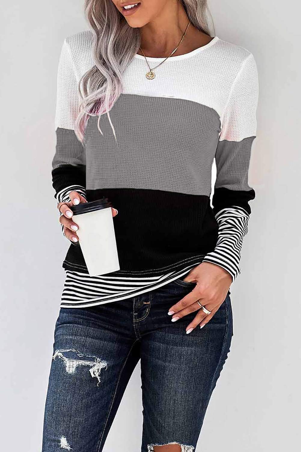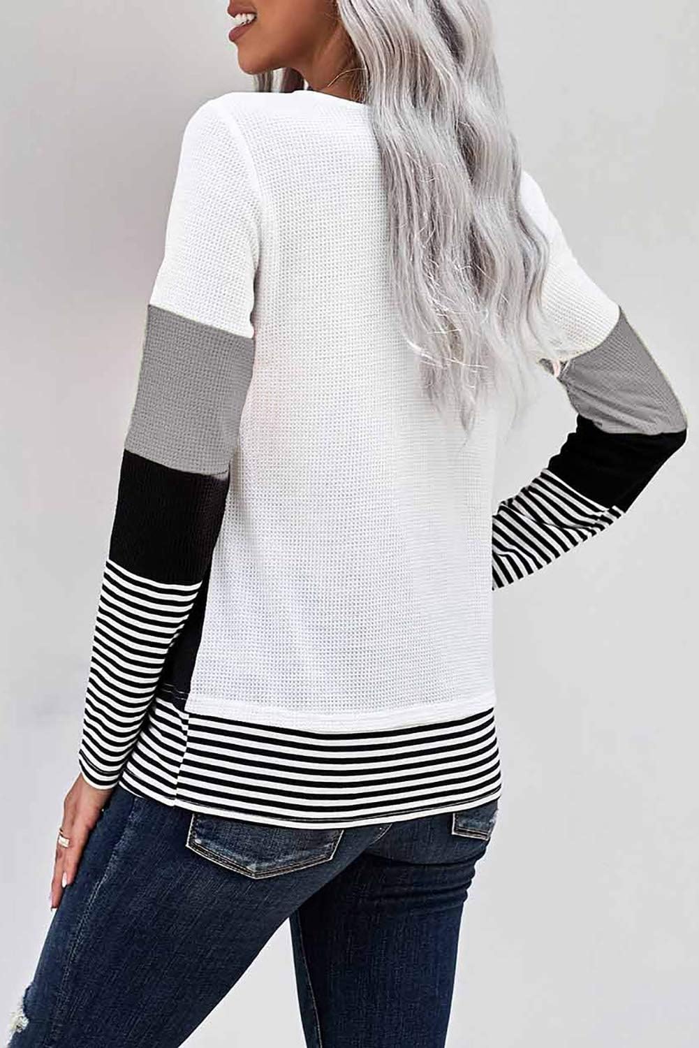 KINGFEN Womens Long Sleeve Color Block Tops Striped Casual Crewneck T Shirts Waffle Knit Sweaters