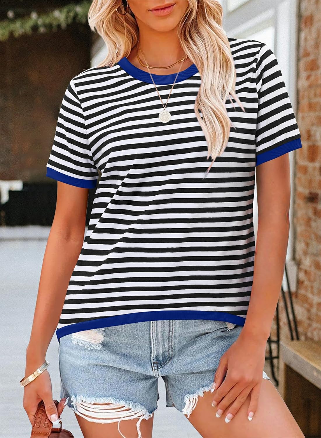 KISSMODA Crewneck Short Sleeve T-Shirts Summer Striped Tops for Women