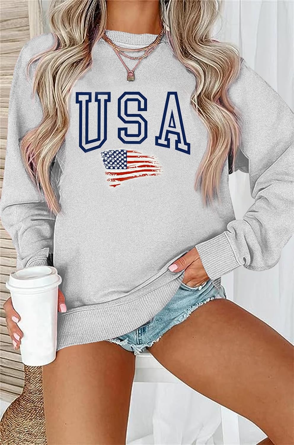 The video showcases the product in use.The video guides you through product setup.The video compares multiple products.The video shows the product being unpacked. Womens USA Sweatshirt Long Sleeve Loose Fit Tees Merchant Video