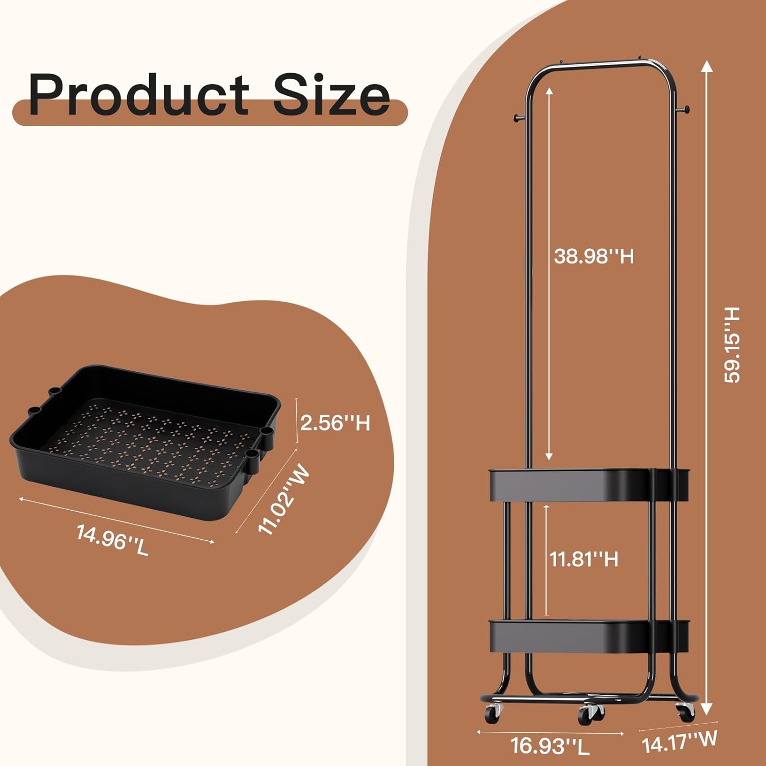 【Spacious Rolling Laundry Cart】: Measuring 16.93″L x 14.17″W x 59.15″H, this rolling laundry cart offers ample space for clothes, shoes, toys, and more. Its double-layer design combines a sturdy clothes hamper with wheels and a hanging rack, making it perfect for laundry room organization