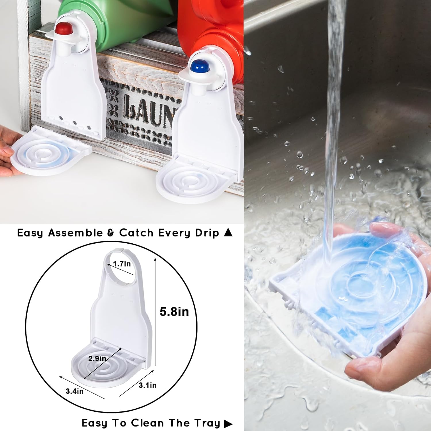 Detergent Drip Catcher Included – Our laundry detergent storage matches with two plastic laundry detergent cup holders that are easy to assemble and wash. And the drip trays will catch any leak or spill to keep your laundry room tidy. What laundry storage!