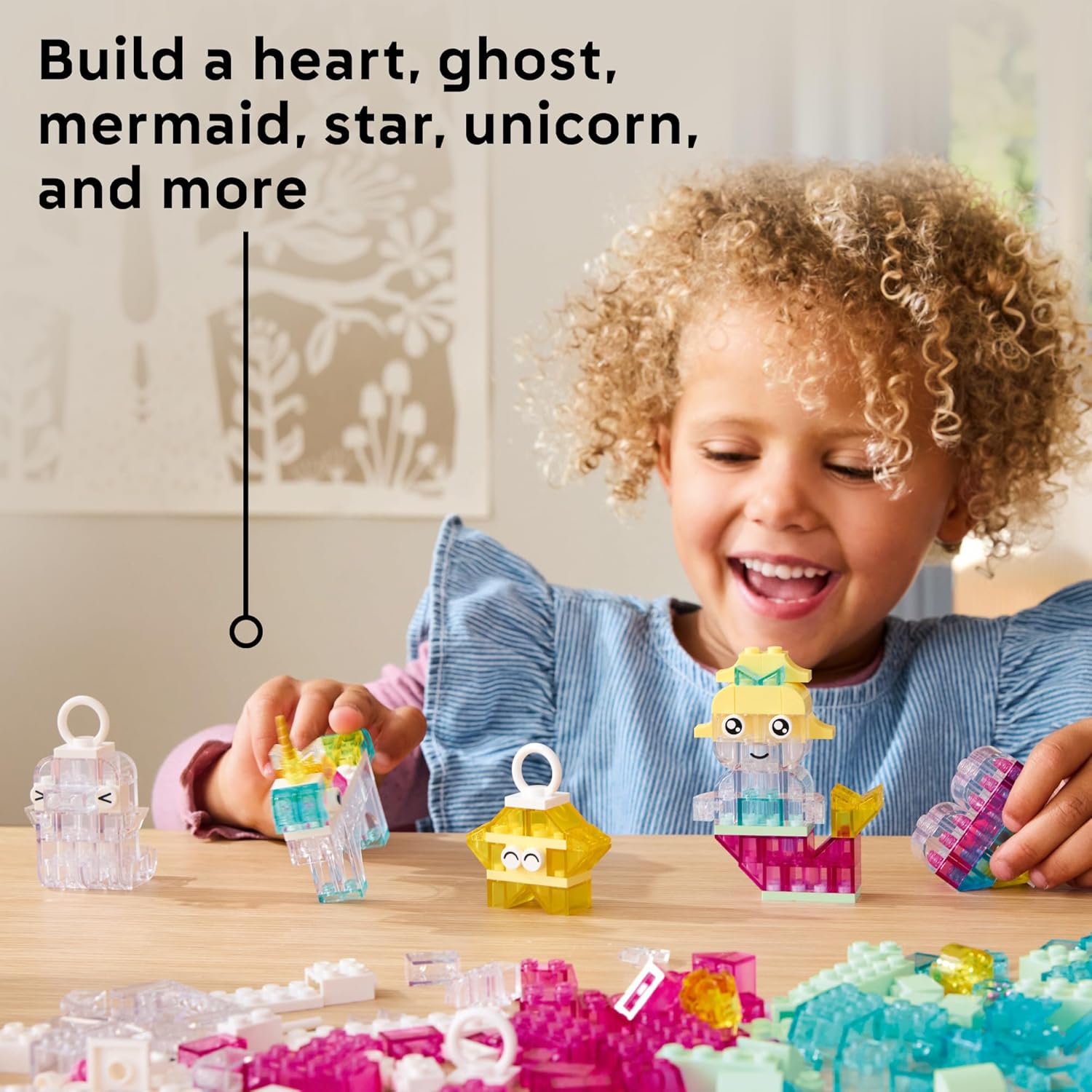 INSPIRE IMAGINATION – Translucent bricks, eye and mouth pieces and hanger-bricks for display add see-through sparkle and extra creative fun to kids’ creations