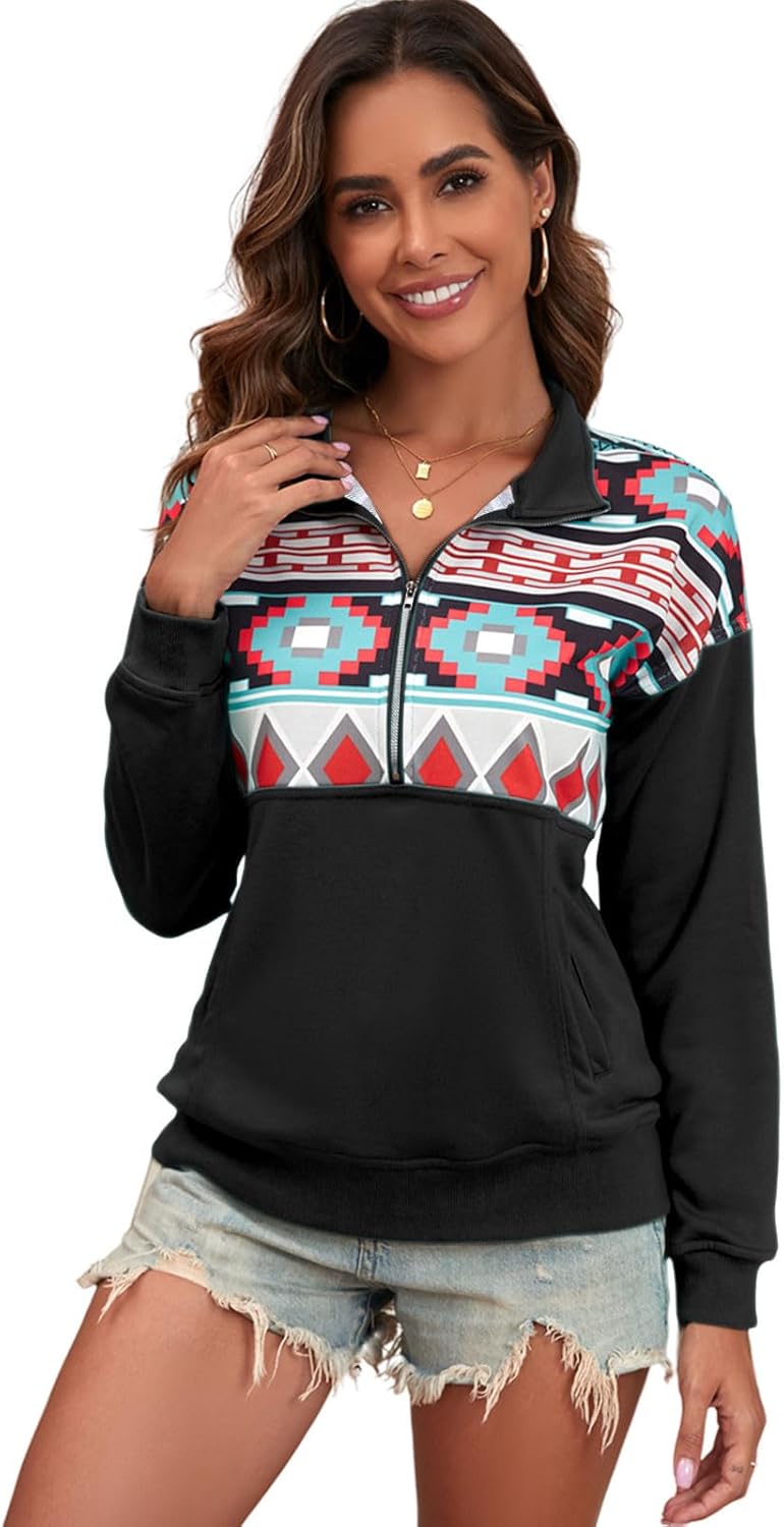 Women’s Casual Aztec Geometric Cow Zipper Collar Pullover Sweatshirt